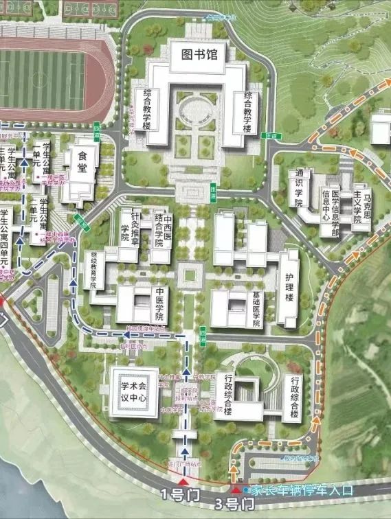 家长车辆入口:家长车辆从学院3号门(充电桩停车场)进入学校临时停放。进入校园后按校内工作人员指定位置停车,校内按指定路线单向行驶,若校内指定停车位已满,则在校外停车点停车,校园及周边实行交通管制