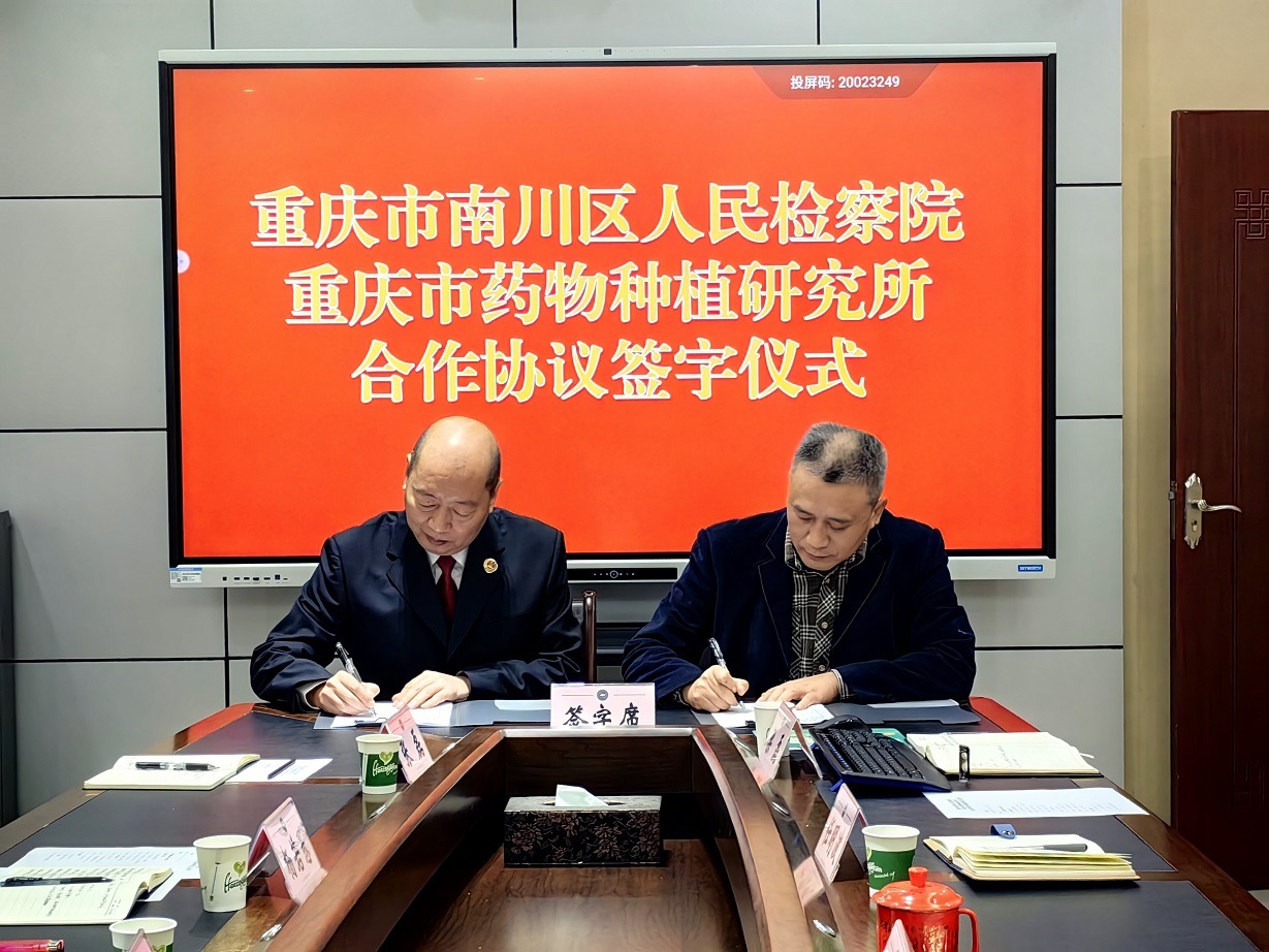 雷治政同志详细介绍了金佛山植物资源分布基本情况、生态系统监测、生态系统恢复与特色资源保护利用等方面的工作情况,他希望区检察院在我所司法鉴定机构申报方面给予支持。江诚同志表示,市药植所成立以来长期开展中药资源调查、保护及栽培研究,为金佛山动植物资源保护做出了积极贡献。当前,区人民检察院正坚持以检察公益诉讼为依托,构建多方参与、高效联动、协作共享的公益保护新格局。市药植所人才众多,专业能力强,在动植物资源调查、鉴定等方面优势突出,希望双方加强合作,共同推动金佛山世界遗产和生物多样性保护可持续发展。双方还签署了关于在金佛山生态环境保护检察公益诉讼工作中加强协作的意见,并在我所挂牌成立生态法治教育基地。