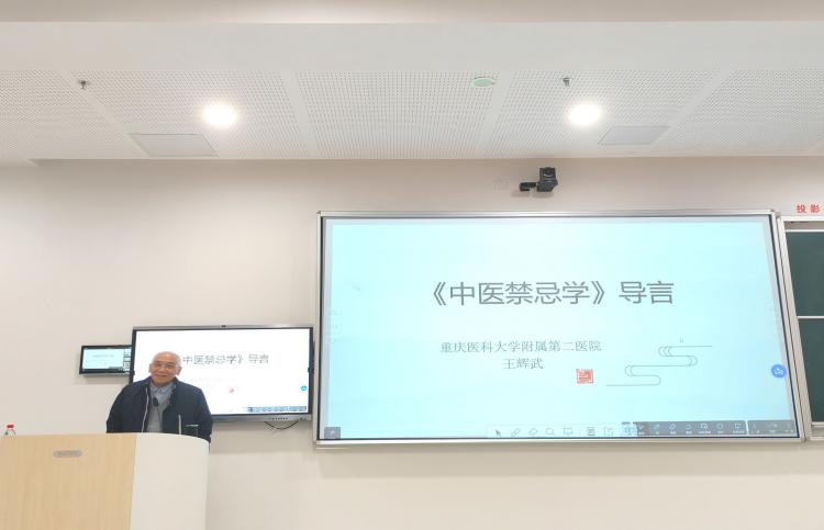 本次讲座由针灸推拿学院院长唐成林教授主持,唐院长首先代表全体师生对两位嘉宾的到来表示热烈欢迎,为列席师生详细地介绍了两位嘉宾的专业背景。王辉武教授作为全国中医药传承博士后合作导师、重庆市中医内科学术带头人,以《中医禁忌学》导论为题,以自身门诊看病实例为引,深入浅出地向同学们讲述了中医禁忌学的发现过程,并将此生动形象地比喻成“我捡到一个耙桃子”。