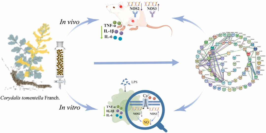 据项目组相关负责人介绍,项目组建立了有效的毛黄堇总生物碱纯化工艺,探究其抗炎和镇痛活性及作用机制。首先探究多种大孔树脂对毛黄堇总生物碱富集纯化的效果。在方法上,采用UPLC-Triple-TOF-MS/MS技术对纯化前和纯化后的提取物(cCTE和pCTE)进行成分分析。在体外采用脂多糖(LPS)诱导的RAW264.7细胞模型比较纯化前后提取物的抗炎作用;体内采用二甲苯致小鼠耳肿胀和醋酸扭体实验来研究其抗炎和镇痛活性,通过检测RAW264.7细胞上清和小鼠血清中NO、IL-6、IL-1β和TNF-α的含量来评价药效。最后采用网络药理学预测毛黄堇的抗炎和镇痛机制,并利用qPCR和Western Blot对关键酶进行验证及流式细胞术检测细胞内Ca2+浓度。