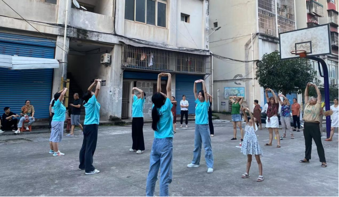 ▲“知行合一”社会实践团还与当地居民共同练习八段锦、五禽戏。社区居民们对这一传统健身功法表现出浓厚兴趣,学习热情高涨,气氛热烈。