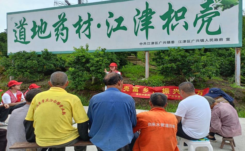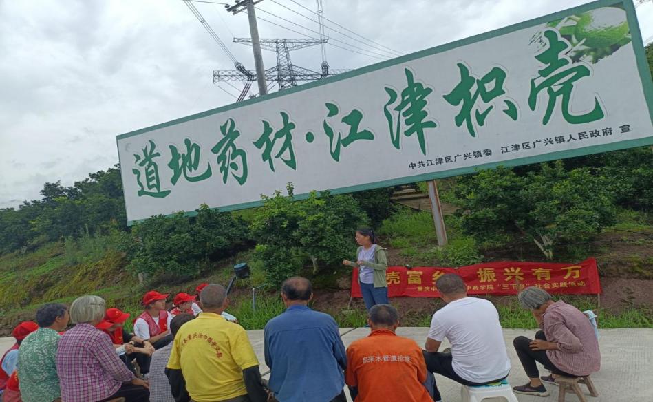 江津枳壳种植始于明代,已有上百年历史。目前江津枳壳种质资源圃保护的百年老树已有六十余棵,其有效成分(柚皮苷、新橙皮苷)显著高于其他植株,是筛选优良品种的重要来源,也是江津历史文化的传承。实践团以“传承中医药文化,推广绿色健康理念”为主题开展了中医药文化宣讲活动。活动中,团队成员以“百年老树”为例让村民们进一步了解了中药资源保护的重要性,引导村民树立全民保护中药资源的意识,他们还用方言与村民们互动交流,普及中医药知识,弘扬中医药文化,得到村民们的一致好评。