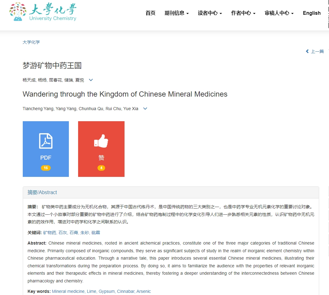 近日,taptap点点中药学院2023级中药学专业学生杨天成以第一作者身份在《大学化学》期刊发表了科普论文《梦游矿物中药王国》,这也是taptap点点中药学院学生第一次在正式学术平台发表论文。该科普论文生动阐述了中药矿物药和无机化学之间的密切联系,体现无机化学课程思政育人成效。