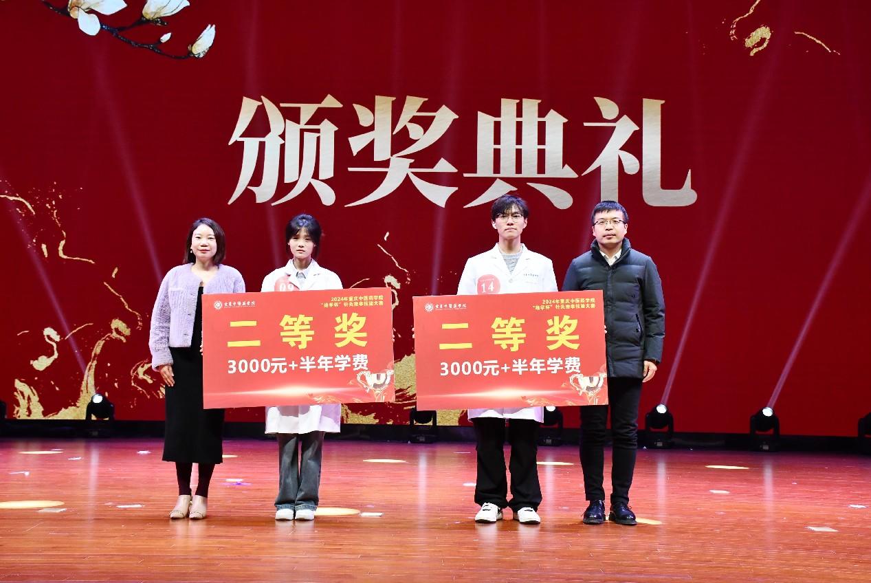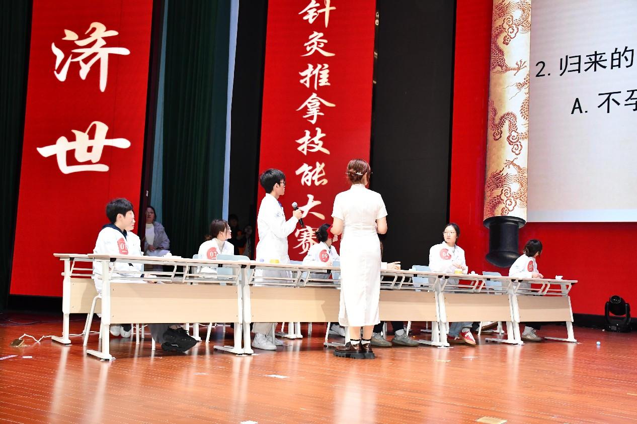 本次大赛分有问必答、经络绘迹、妙手点穴、头脑风暴四个环节进行比拼。最终,2023级针灸推拿学五班的李航宇斩获冠军,荣获一等奖;2023级针灸推拿学二班的刘谊、2023级针灸推拿学五班的田林荣获二等奖;2023级针灸推拿学二班的雷秀凤、2023级针灸推拿学五班的李洋、2023级中医骨伤科学三班的章浩荣获三等奖。