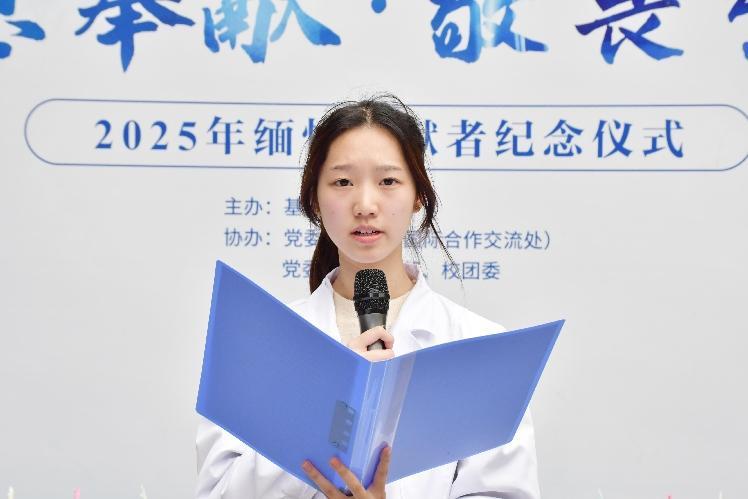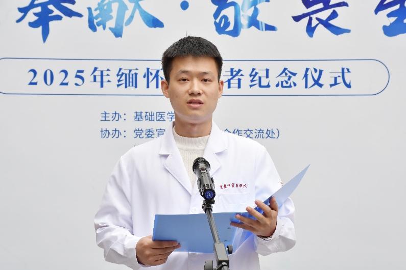 纪念仪式上,taptap点点基础医学院人体解剖与组织胚胎学教研室郑银老师作为教师代表发言。他说,遗体捐献者是特殊的医学“引路人”,我们尊称为“大体老师”。他们以身躯为教材,用生命最后的余温照亮医学前路;以最深沉的方式诠释了“传道授业”的真谛;用志愿行动,践行着“人道、博爱、奉献”的红十字精神。他们是我们所有医学生的“无言良师”。