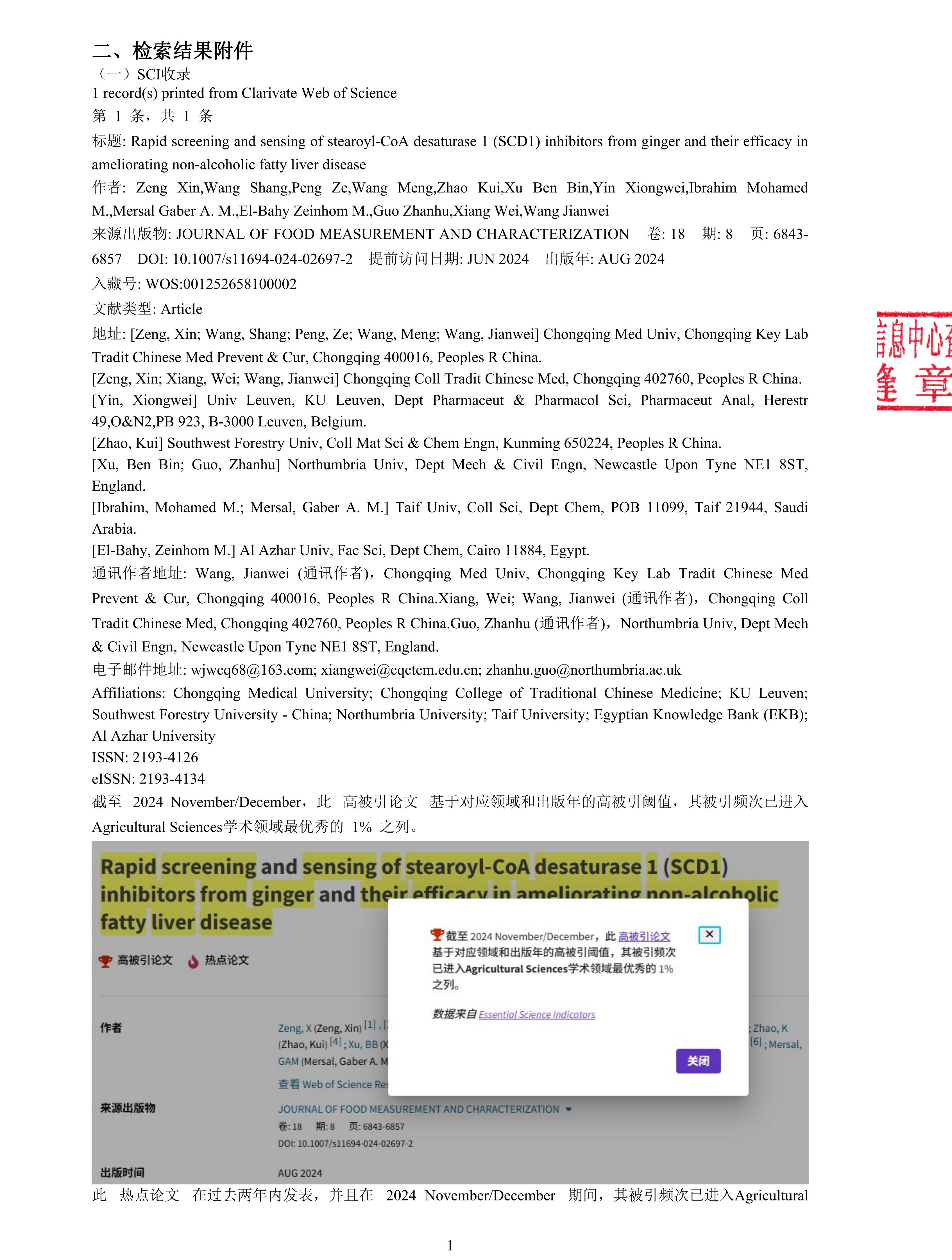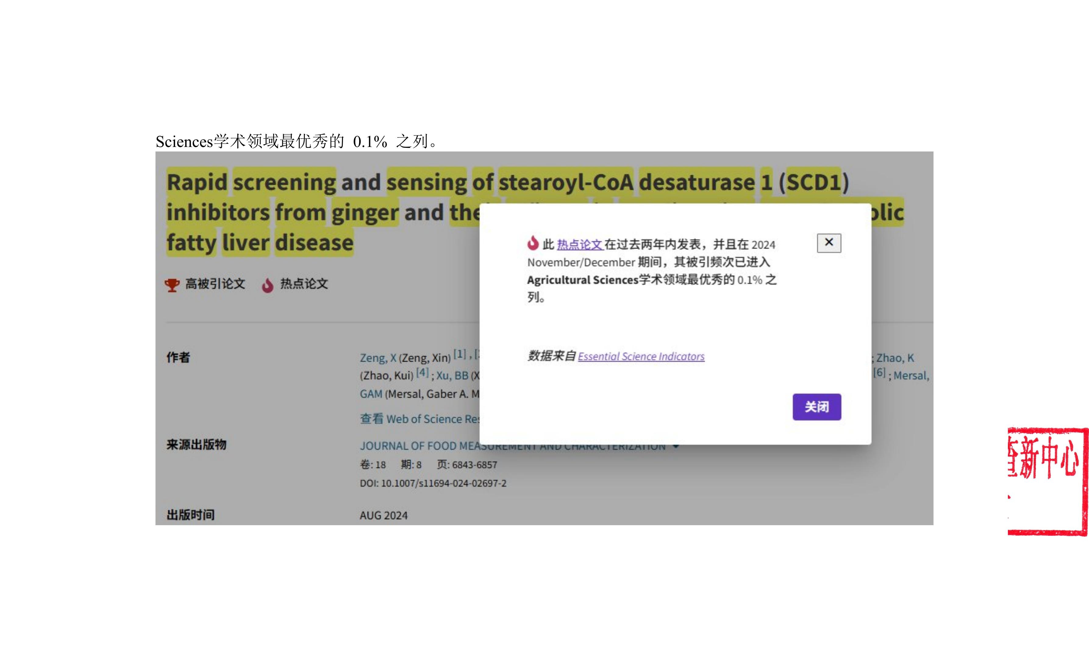 近日,taptap点点中医药防治代谢性疾病传承创新团队前期发表的题为“Rapid screening and sensing of stearoyl-CoA desaturase 1 (SCD1) inhibitors from ginger and their efficacy in ameliorating non-alcoholic fatty liver disease”(《姜中SCD1抑制剂的快速筛选及其改善非酒精性脂肪肝的作用》)的SCI论文,同时入选农业科学领域ESI热点论文和ESI高被引论文。该项研究通过快速筛选手段发现了姜中潜在的SCD1抑制剂(6-姜酚、8-姜酚及10-姜酚),并首次揭示了10-姜酚具有改善非酒精性脂肪肝的作用。