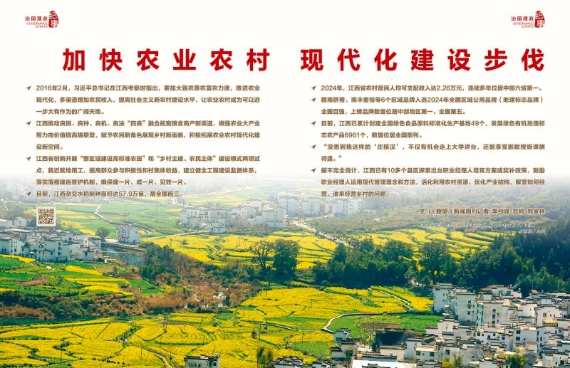 推进乡村全面振兴,既是重大的政治任务,也是重要的发展机遇。《关于进一步深化农村改革、扎实推进乡村全面振兴的实施意见》《关于加快推进农业产业化高质量发展的实施意见》《江西省农业七大产业高质量发展三年行动方案(2023-2025年)》……江西出台系列政策文件,推动良田、良种、良机、良法“四良”融合拓宽粮食高产新渠道,做强农业大产业努力向价值链高端攀登,赋予农民新角色展现乡村新面貌,积极拓展农业农村现代化建设新空间。
