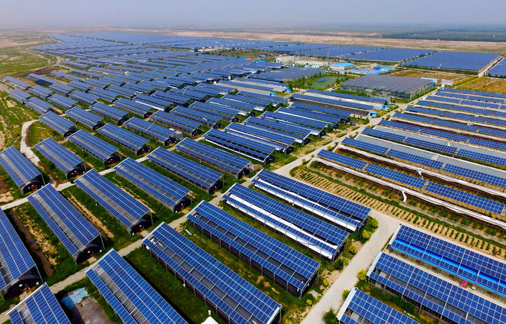 如今的闽宁镇,加速拥抱新质生产力,又有了新名片——“绿电小镇”,一块块蓝色光伏板整齐排列在空地、屋顶。(国网宁夏电力有限公司供图)