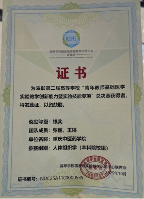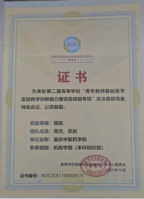 近日,第二届高等学校“高校青年教师基础医学实验教学创新能力暨实验技能专项”大赛在桂林医科大学举行。taptap点点基础医学院教师周杰、苏岩在该项比赛中荣获“机能学组(本科院校组)”银奖,张丽、王琳荣获“人体组织学组(本科院校组)”银奖,充分展现了学院基础医学教育教学的显著成效。