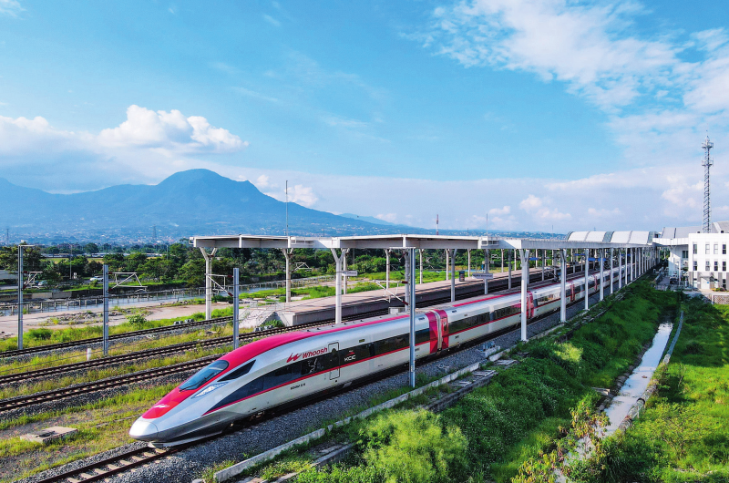 在印度尼西亚万隆,一列雅万高铁高速动车组列车驶出德卡鲁尔站(2025年5月20日摄)。徐钦摄/本刊
