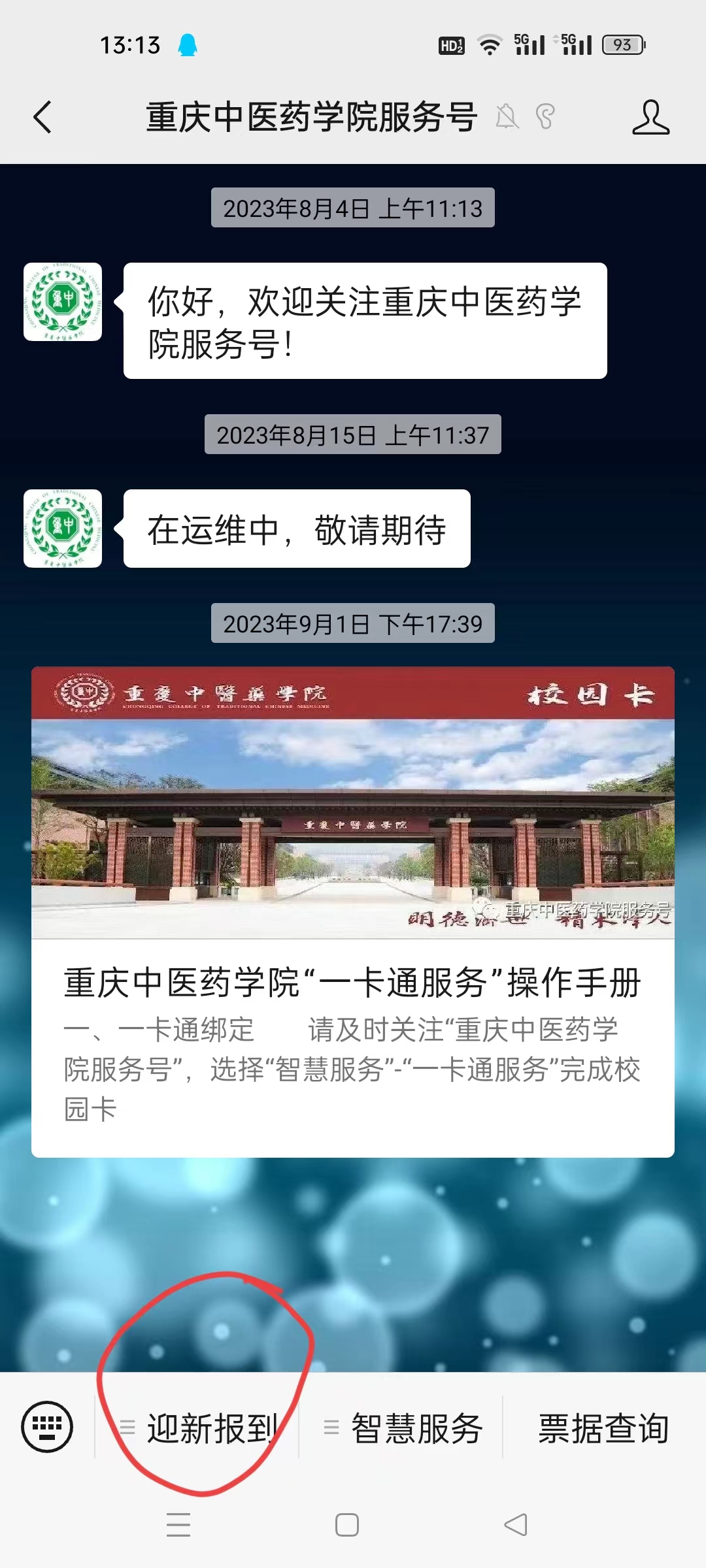 1.试运行期间,报修人可通过手机端登录“taptap点点官方网站服务号”,进入到“taptap点点官方网站服务号”主界面,点击“迎新报到”。