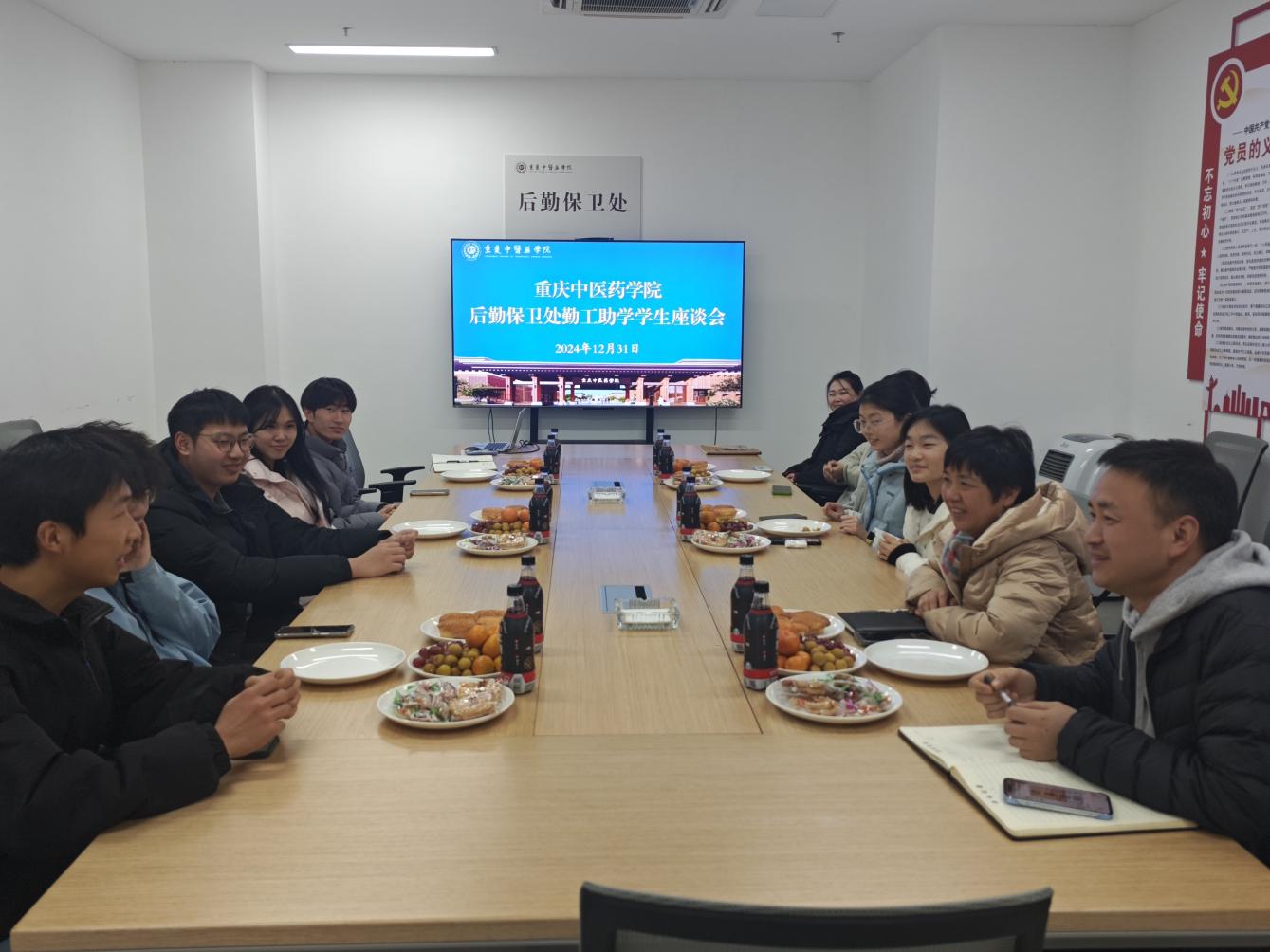 12月31日中午,后勤保卫处在H-112会议室召开后勤保卫处勤工助学学生座谈会。会议旨在进一步规范管理后勤保卫处学生勤工助学工作,充分发挥劳动育人实效,帮助家庭经济困难同学顺利完成学业、健康生活成长。后勤保卫处处长黄小平、综合管理科科长袁瑛、物业管理科副科长刘娇娇、综合管理科王太旭和后勤保卫处勤工助学学生参加了座谈会。