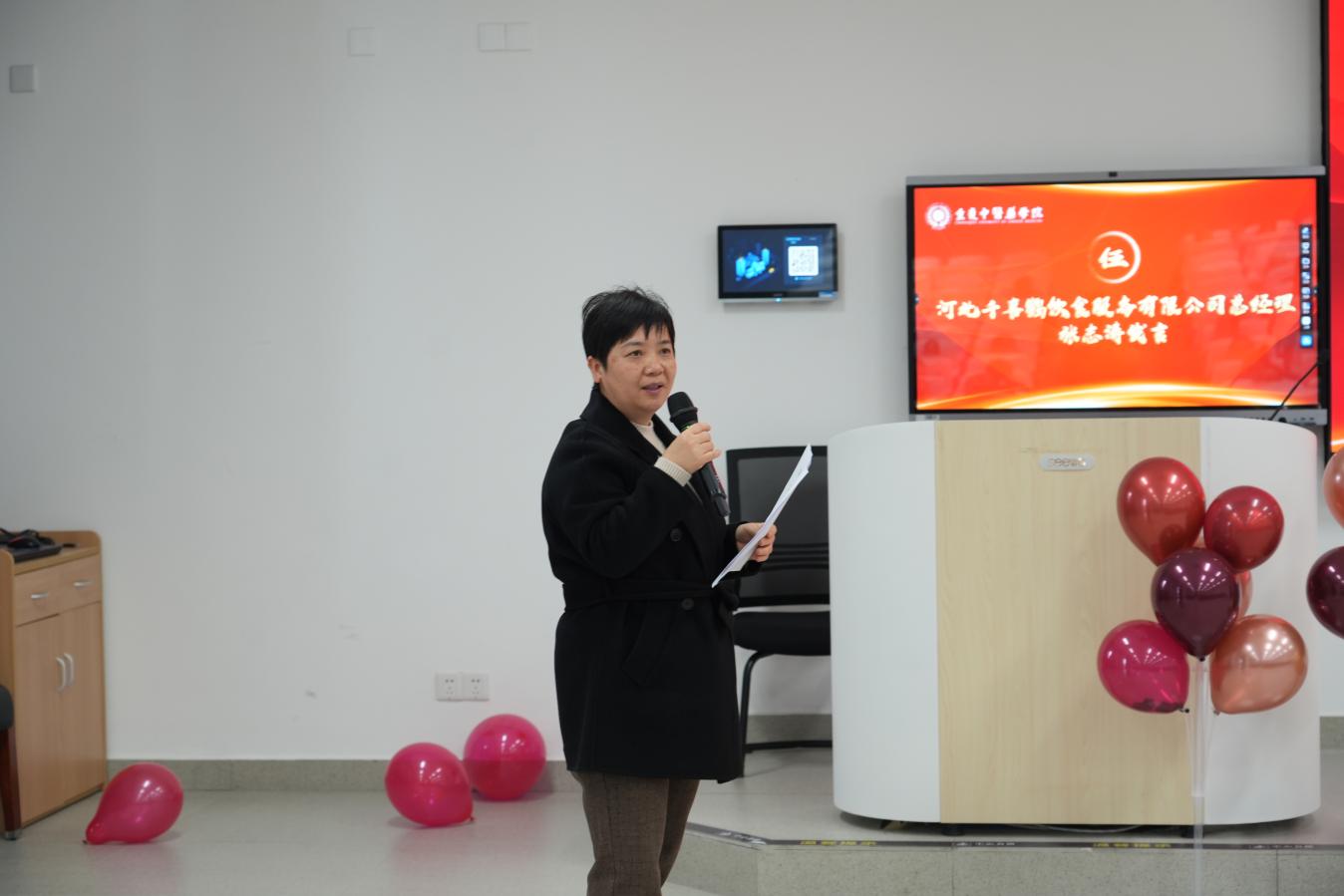 获奖员工代表陈程发言,她感谢学校领导和公司的认可,并表示将不忘初心,继续提升专业知识和技能,为后勤工作贡献力量。