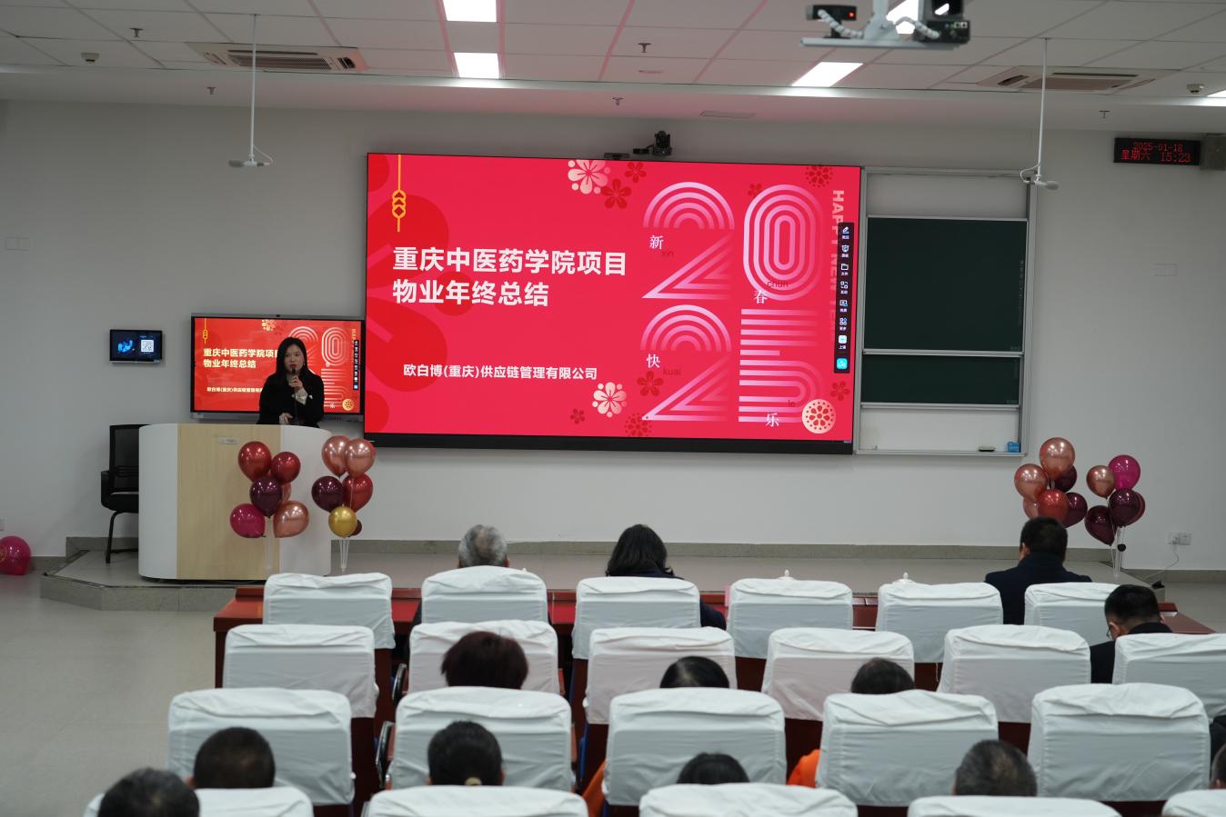欧百博(重庆)供应链管理有限公司和河北千喜鹤饮食股份有限公司的负责人也分别对物业和食堂工作进行了总结与回顾,并介绍了2025年的工作目标。