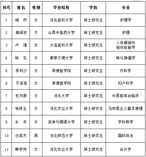 按照市委组织部、市人社局《关于印发< 承德市事业单位选聘高层次和急需紧缺人才暂行办法>的通知》(承人社[2014]23号)文件精神,beat3652020年公开选聘工作人员按规定程序,历经报名、资格审查、面试、体检、政审等程序,现已进入公示阶段,经审核,共有胡然等11名同志符合聘用条件,现予公示。公示期七个工作日(2020年10月12日—10月20日),公示期满将办理聘用手续。如对公示结果有异议,欢迎监督举报。