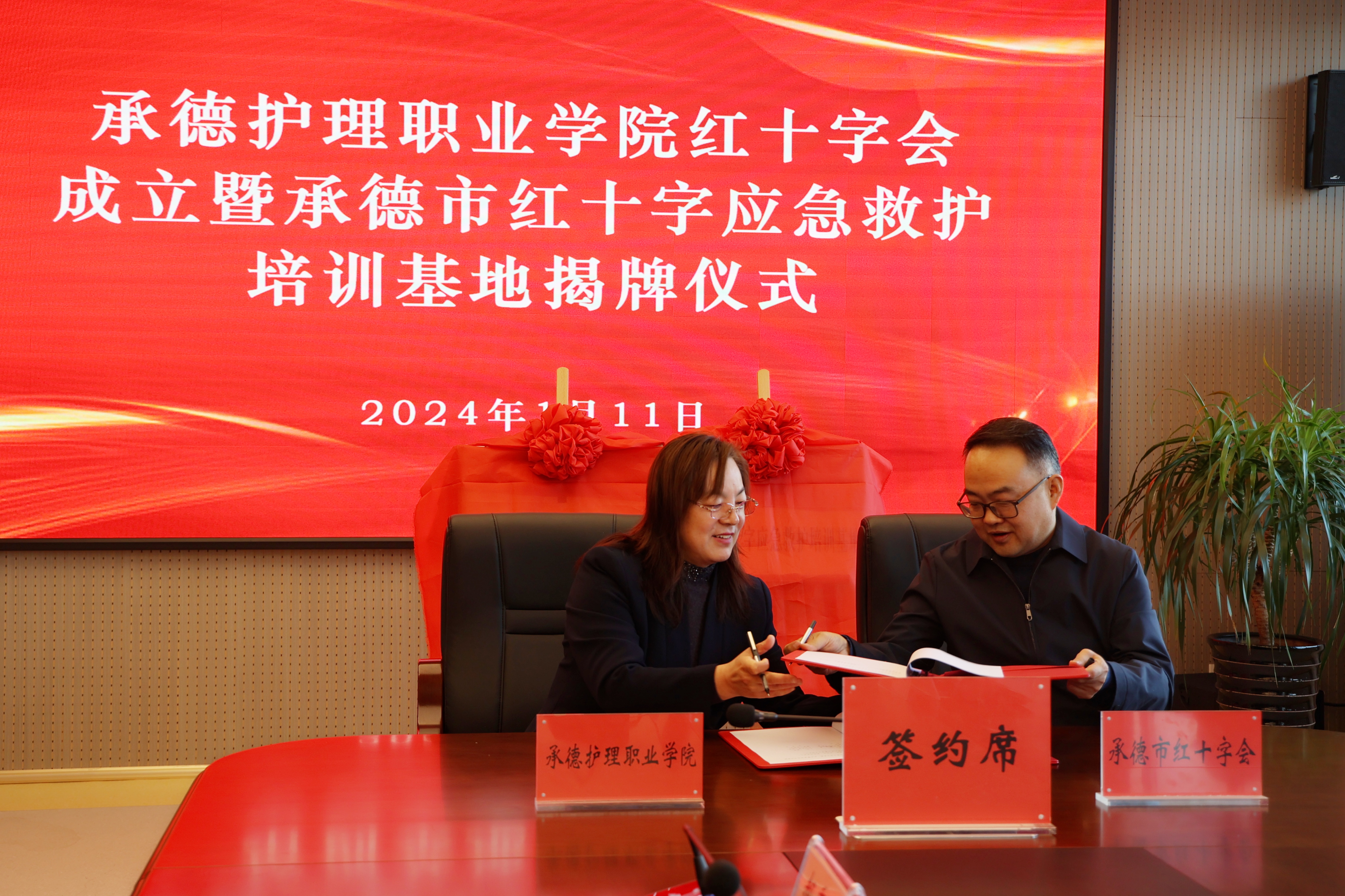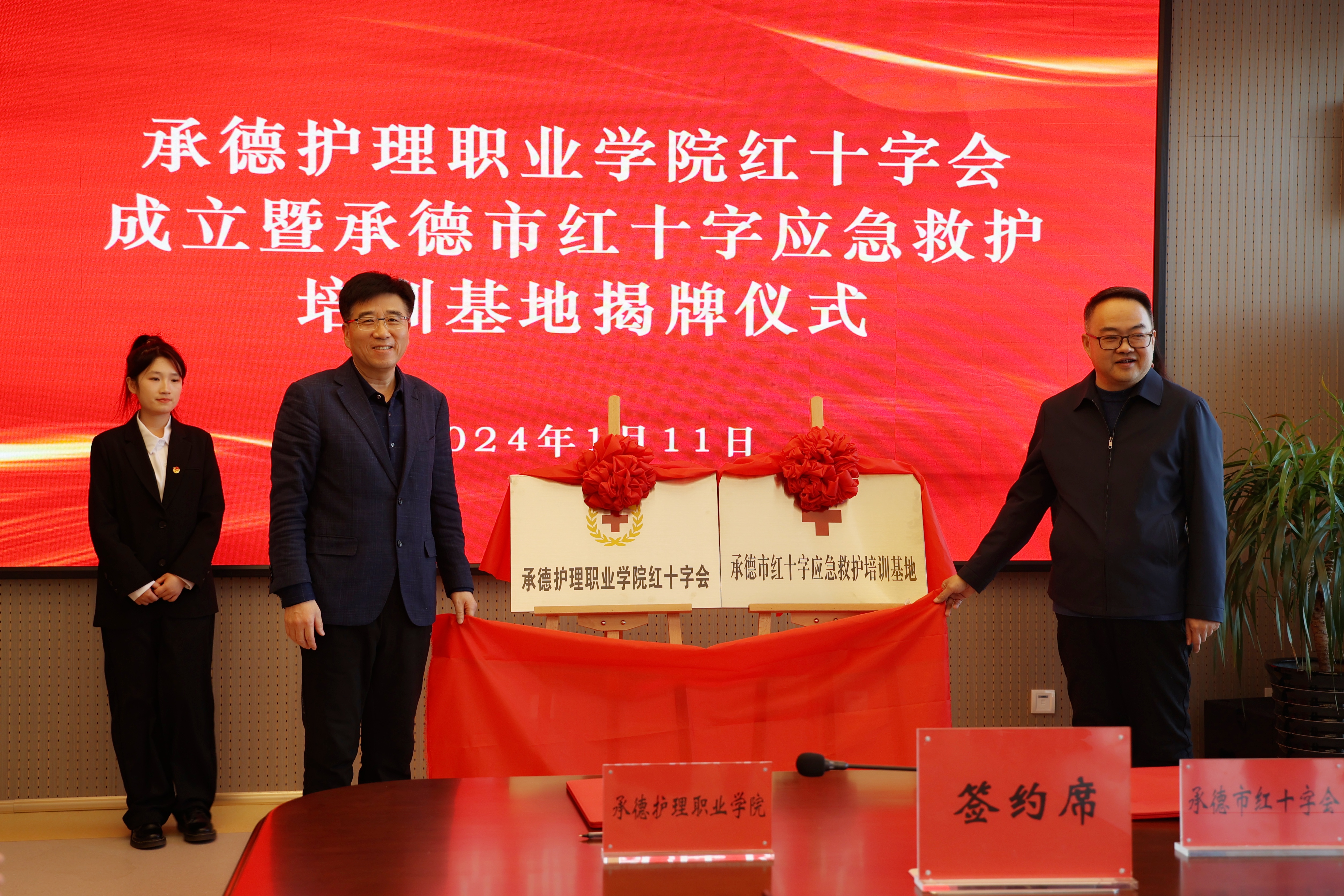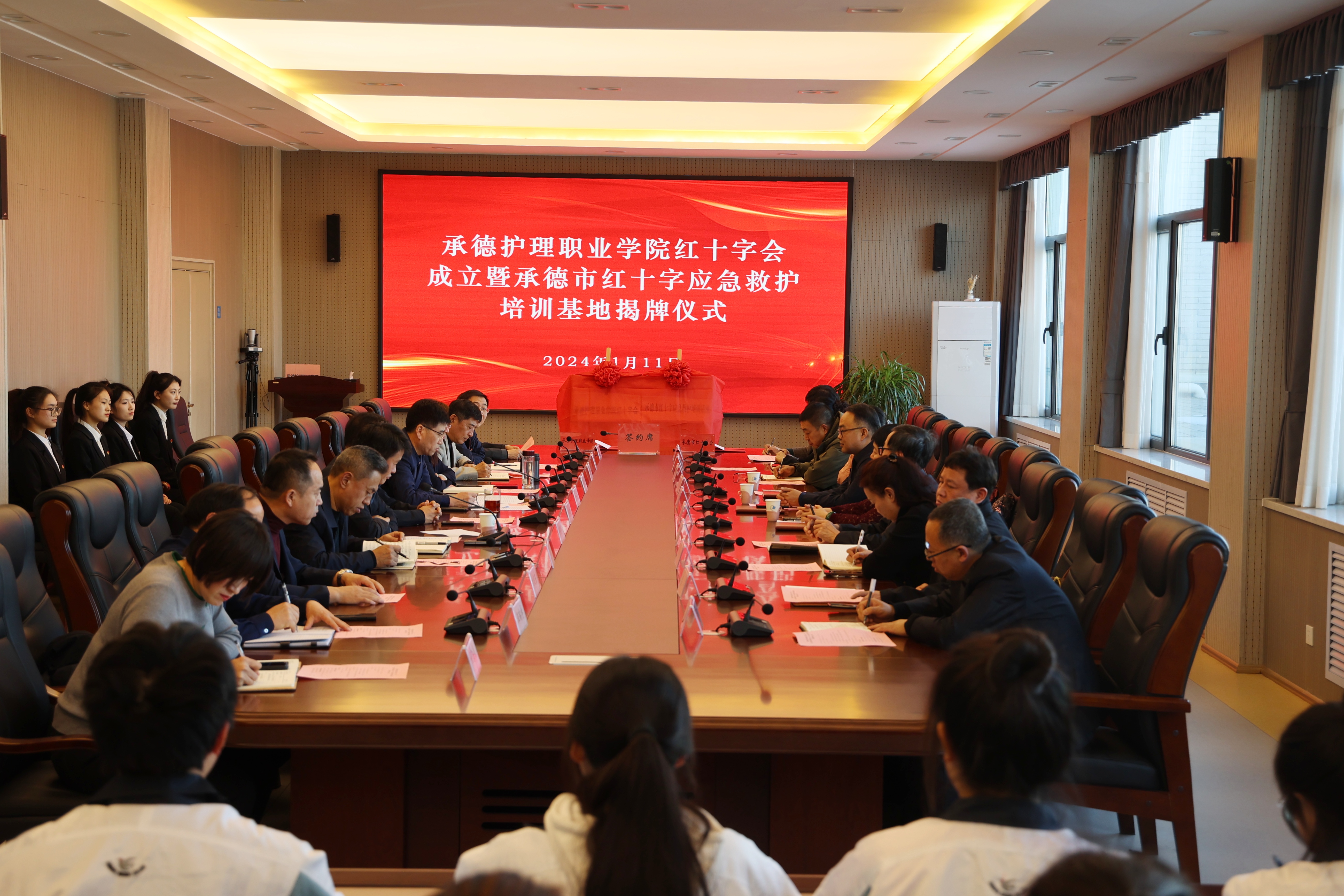 为进一步贯彻落实健康中国行动(2019-2030)战略部署要求,助推健康河北承德行动落实落细,促进医学教育事业与红十字会“三救三献”志愿服务事业健康融合发展,1月11日,学校在行政楼601会议室举行“beat365正版唯一官网必一红十字会成立暨承德市红十字应急救培训基地揭牌仪式”,校党委书记高中卫、校长单伟颖、学校领导班子成员、承德市红十字会副会长曾强,以及市红十字会相关人员,学校教务处、学工部、团委、各系部负责人及学生代表参加了此次仪式。仪式由副校长徐国辉主持。