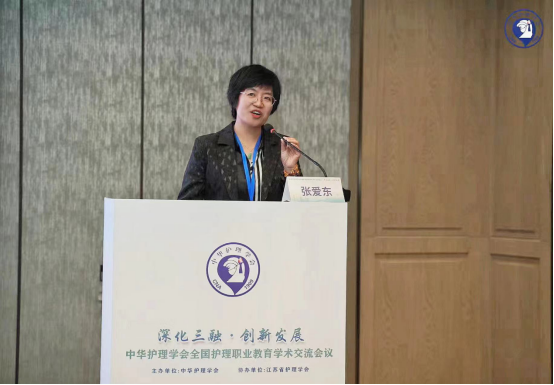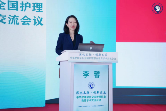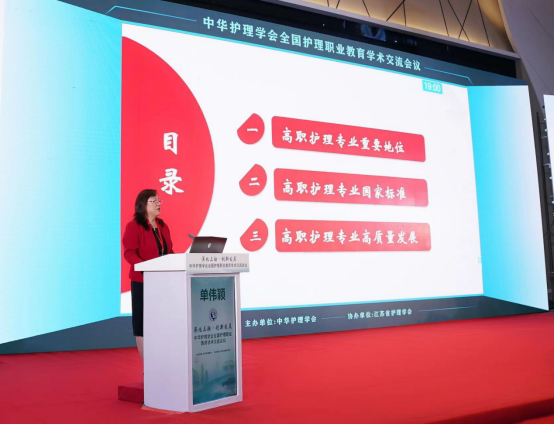 单伟颖在会上作了《贯彻落实国家标准确保高职护理人才培养质量》的报告,她结合国家相关政策,从高职护理专业重要地位、高职护理专业国家标准、高职护理专业高质量发展三方面进行了阐述,随着健康中国战略提出,高职护理教育发展要面向国家重大需求,面向人民生命健康,通过分析国家高职护理专业教学标准,提出要健全专业教学质量监控管理制度,加强课程建设水平及质量改进,完善建设质量标准,建议各院校要以定位清晰、合理招生、培养过程等方面规范并提升高职护理专业人才培养。
