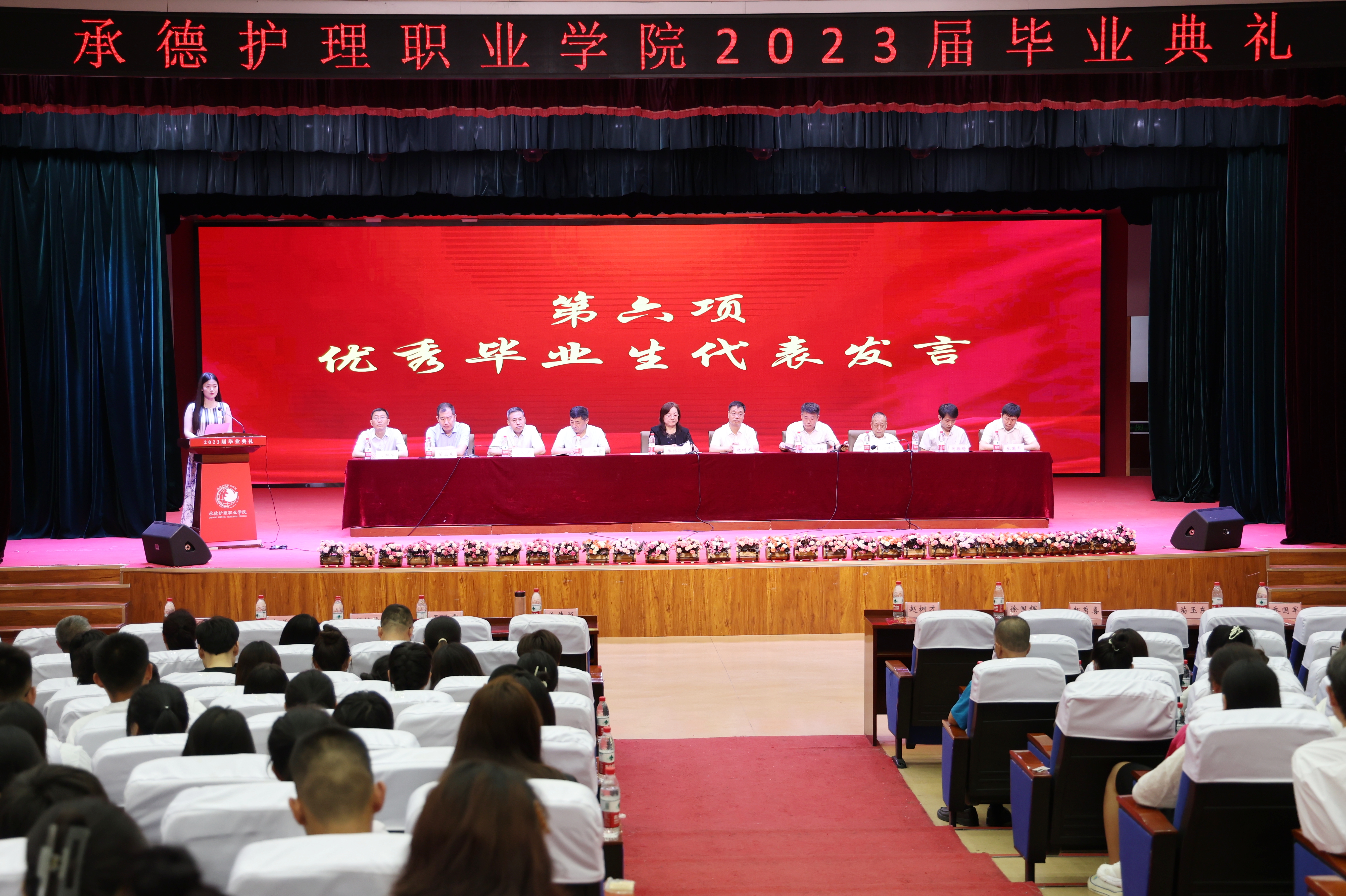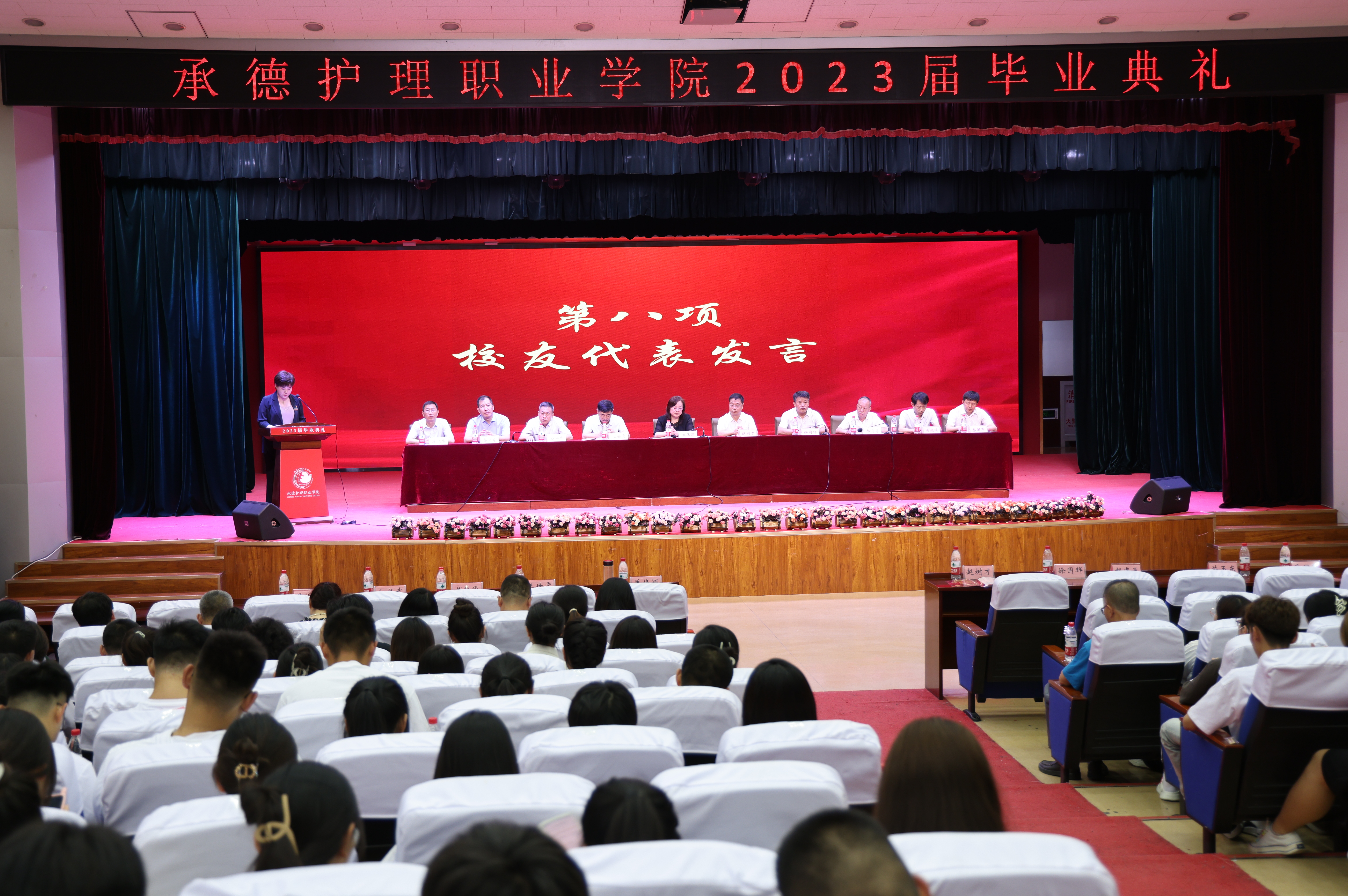 承德市中医院重症监护室护士邢天逸作为校友代表发言,分享了她三次临危受命、不畏艰险、挺身而出,逆行出征抗击新冠疫情的光荣事迹,并结合自身成长经历,为同学们入职工作带来了宝贵的建议。