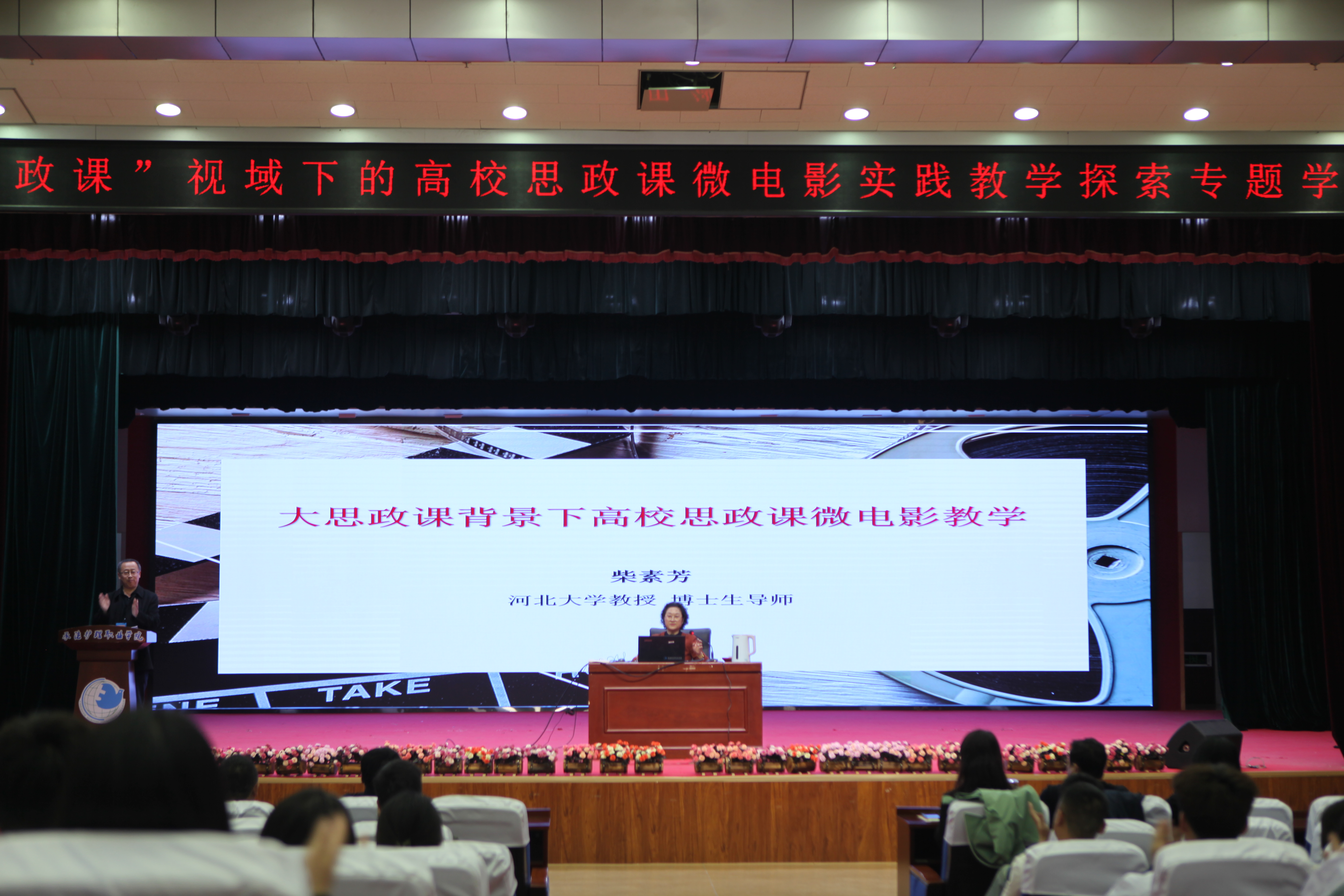 3月30日下午,思政部在3号教学楼五楼会议厅举办“大思政课”视域下的高校思政课微电影实践教学探索”学术讲座,邀请河北大学马克思主义学院教授、博士生导师,教育部首批“全国高校思政课名师工作室”负责人、教育部首批“全国高校思政课教师度影响力人物”、教育部首批“全国高校思想政治工作精品项目”入选者柴素芳教授做专题讲座,教务处、学生工作部(团委)、各系部的负责人、辅导员、思政部全体教师及部分学生代表参会。讲座由思政部主任徐鹏辉主持。