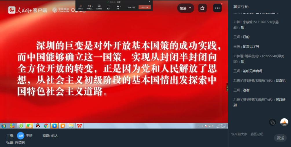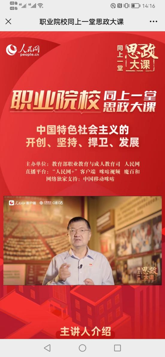 为深入贯彻落实习近平总书记关于“大思政课”和职业教育的重要指示,教育部职业教育与成人教育司会同人民网联合推出职业院校师生“同上一堂思政大课”系列课程活动。为保证全校师生均能在9月17日下午2点按时参加学习,学校及时进行了课程调整,授课教师通过直播分享屏幕,师生共同收看了“同上一堂思政大课”系列课程活动的第一课。