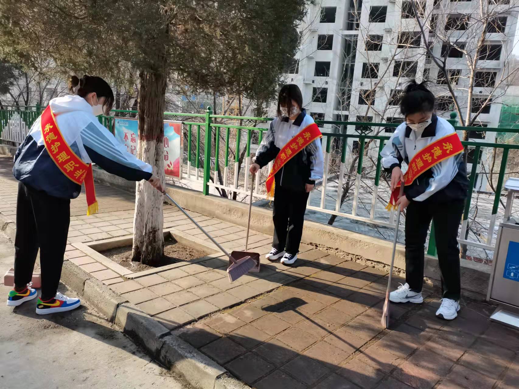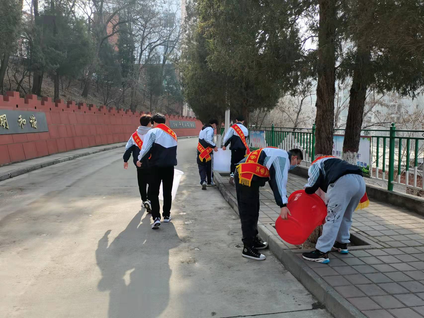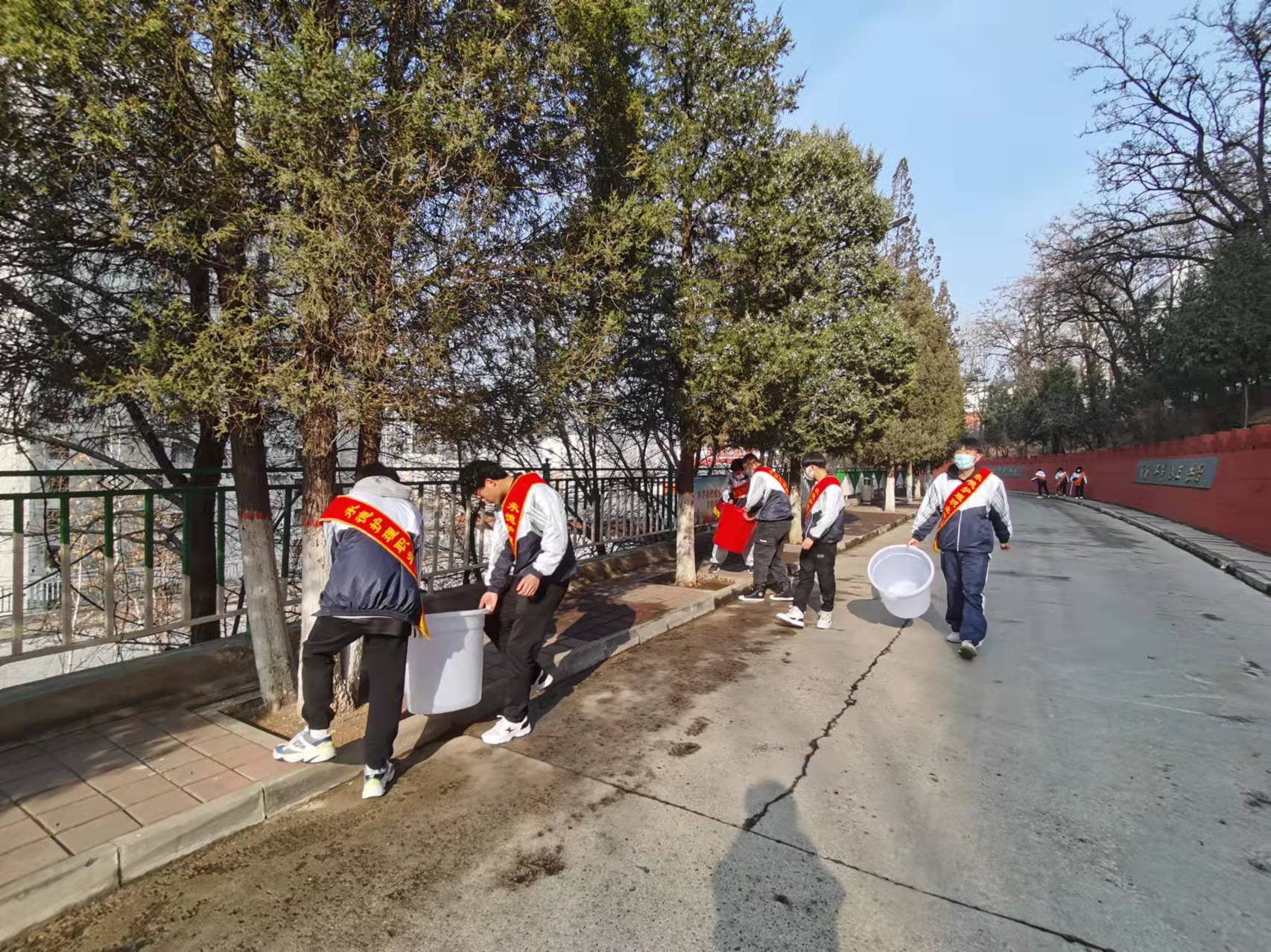 清晨学生们排着整齐的队伍,肩披绶带,在行政楼门前集合,大家分工明确,齐心协力,有的用手中的扫帚清扫树旁垃圾和落叶、有的用铲子清除树坑中的硬物,有的两人一组,为树木浇水。活动现场热火朝天,到处回荡着同学们的欢声笑语。