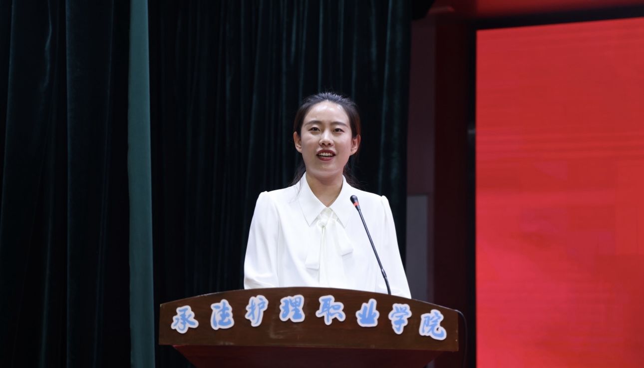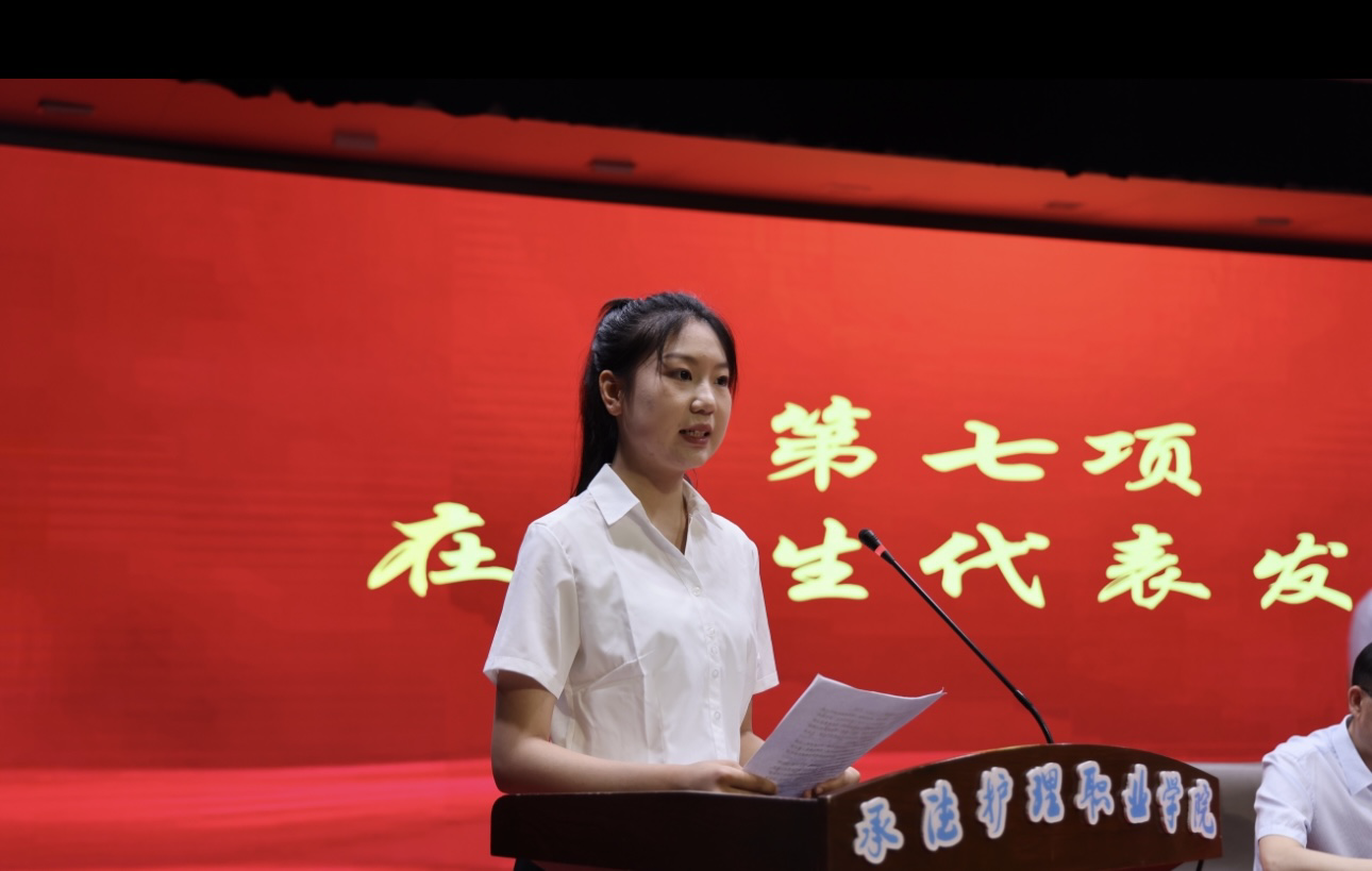 涉外护理系2023级涉外护理11班刘佳桐同学代表在校生发言。表示将以优秀毕业生为榜样,刻苦学习,锐意进取,无私奉献,努力提升自己的综合素质和实践能力,以更饱满的热情、更坚定的信念迎接未来的挑战与机遇。