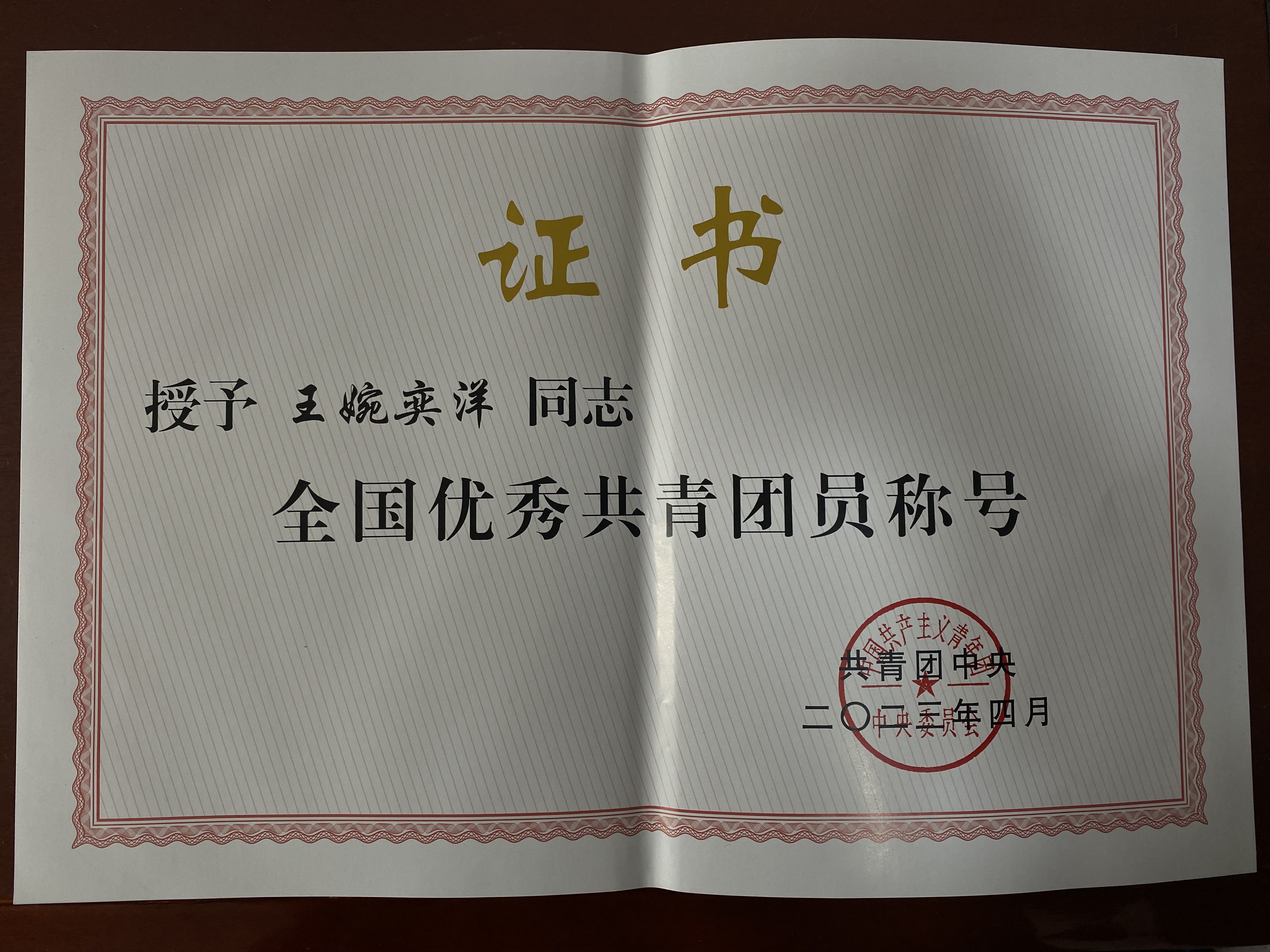 beat365学生王婉奕洋荣获“全国优秀共青团员”称号