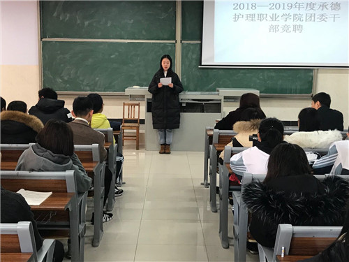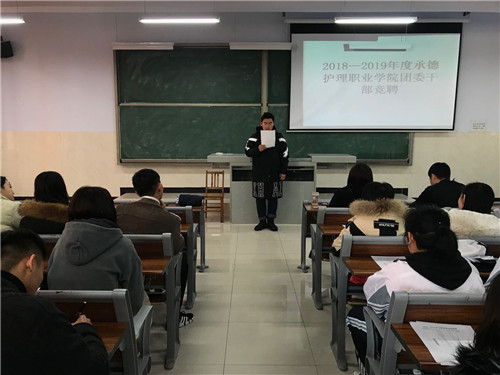 2018年11月22日中午,团委在体育馆2楼阶梯教室组织召开2018-2019年团委会副部级干部竟聘大会。担任评委有:学院团委书记陈荟洁、安全工作处副处长兼团委副书记潘嵩、团委副书记兼护理系团总支书记张博、团委学生副书记、组织部、宣传部部长等5人,以及团员代表70余人参加本次竞聘大会的评选。
