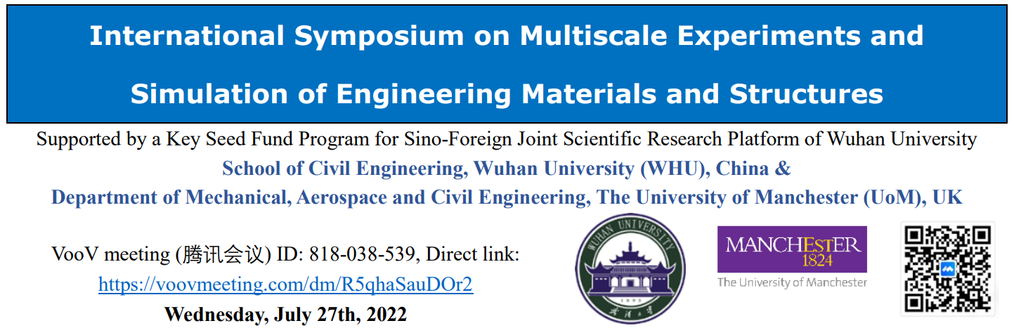 7月27日,由雷竞技raybet登录入口-曼彻斯特大学先进材料与结构多尺度研究联合科研平台种子基金(No. WHUZZJJ202208)资助的“工程材料和结构多尺度实验与模拟国际研讨会”于线上召开。研讨会由雷竞技raybet登录入口土建学院杨贞军教授和英国曼彻斯特大学工学院Yong Wang教授联合主持,平台双方各四人(武大:杨贞军教授、张超教授、池寅副教授和刘辉副教授;曼大:Yong Wang教授、Qingming Li教授、Philip Withers教授和Lee Margetts教授) 在基于微观CT图像的材料断裂损伤模拟、纤维混凝土本构关系、钢结构抗火性能、轻质多孔材料抗冲击性能、高性能并行计算力学等领域做了国际前沿学术报告,并开展了热烈讨论。其中英国皇家学会和皇家工程院院士、中国工程院外籍院士Philip Withers教授热情洋溢的精彩报告(Time resolved 3D imaging and its role in the development of multiscale understanding and modelling of engineering materials) 吸引了海内外140多名研究人员参加和互动。最后,项目负责人杨贞军教授和Yong Wang教授对研讨会进行了总结并对下一阶段的合作交流计划进行了讨论。