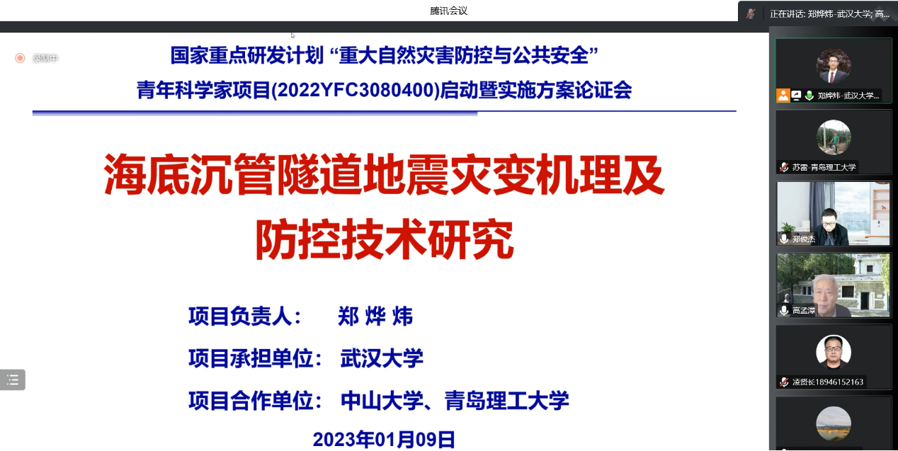 2023年1月9号,由雷竞技raybet登录入口牵头承担,雷竞技raybet登录入口郑烨炜教授主持的“十四五”国家重点研发计划“重大自然灾害防控与公共安全”重点专项青年科学家项目“海底沉管隧道地震灾变机理及防控技术研究”启动暨实施方案论证会顺利召开,会议采用线上会议形式进行。
