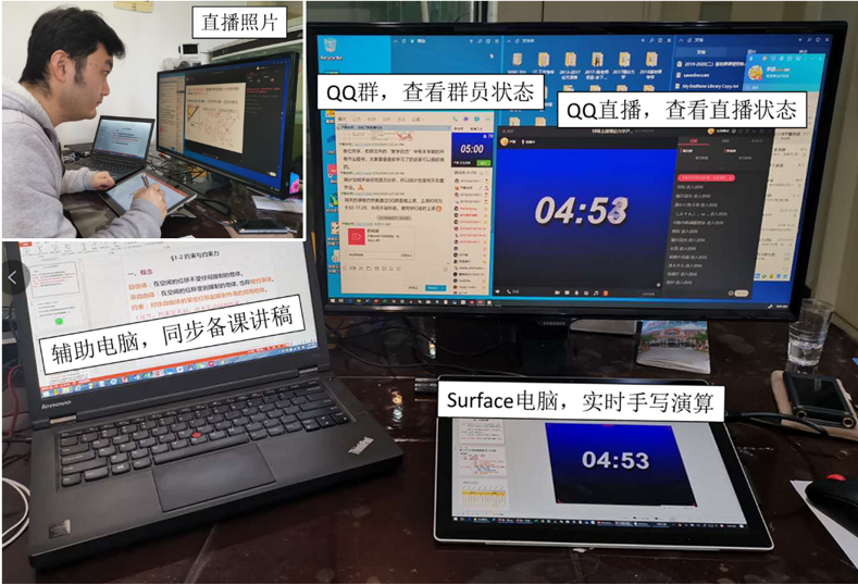 《理论力学》作为一门理论性较强的技术基础课,除了在概念上要求清晰的讲解,在平常的课程中还穿插着大量的课间练习。在上完第一节课后,我发现简单的直播PPT的教学方式难以将解题过程中的一些技巧和难点讲清楚。但是这些技巧和难点正式学习理论力学的重点所在。因此,我在第二次课使用了带手写笔功能的Surface笔记本电脑,通过实时分享屏幕的方式,在直播的过程中通过直接的方式为学生展示解题过程并进行解题步骤的清晰解说,取得了较好的反馈。有学生们反应“明白了”、“涨知识了”等等。同时我通过实时监控QQ群和直播平台,了解学生的学习状态和学习问题,及时做出针对性的反馈。具体硬件设置如下图所示。
