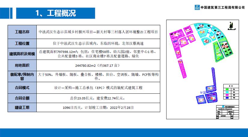 本次讲解的工程是中法武汉生态示范城乡村振兴项目——新天村等三村落人居环境整治工程项目,该项目位于中法武汉生态示范城内,东临四环线,北邻汉蔡高速,总建筑面积近80万平方米,是合同模式采用EPC 模式的装配式建筑工程。
