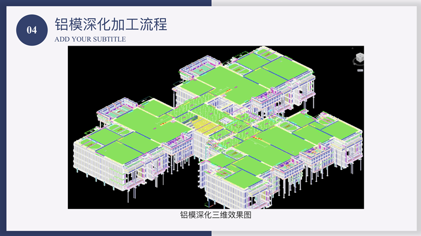 在介绍创新的铝合金模板体系时,焦鹏工程师分别对铝模模板不同体系的对比、加工流程、施工流程、快拆体系以及现场安装进行详细的阐述,包括墙体找平、钢筋纠偏、安装与加固的具体步骤等。