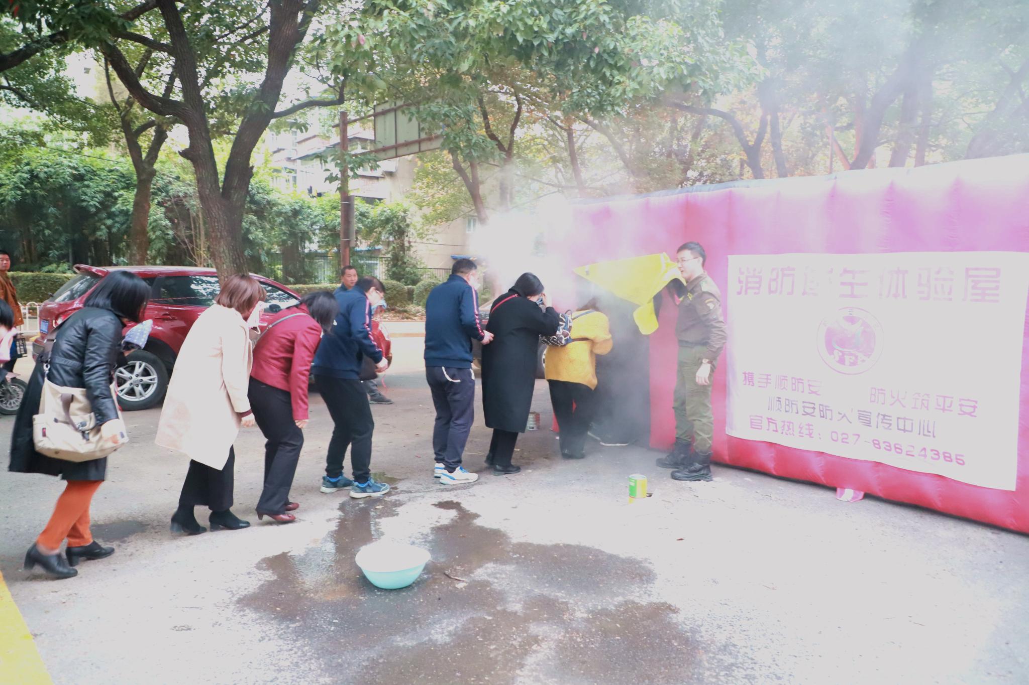 讲座结束后,全院师生来到结构大厅门前空地,进行模拟火灾现场逃生演习和消防器械实操演练。湖北省消防中心培训教员首先介绍了进行模拟火灾逃生演练的目的和意义,讲述了火灾逃生的技巧,给师生现场示范讲解防烟面具的使用及正确使用毛巾等简易防护手段来自我保护的方法。随后,全体师生有序进入模拟逃生帐篷,不仅演练了用湿毛巾捂上口鼻、低下身体逃离火场的技能,还切身感受到了着火、烟熏时自身慌乱的情绪,身临其境的演练让大家印象深刻。