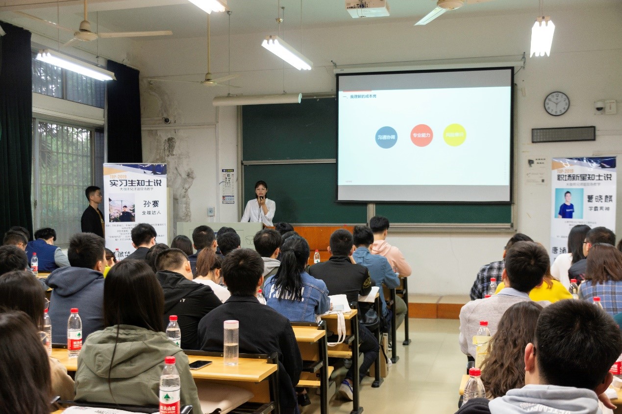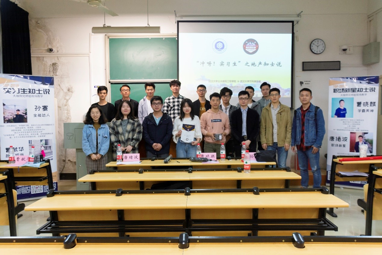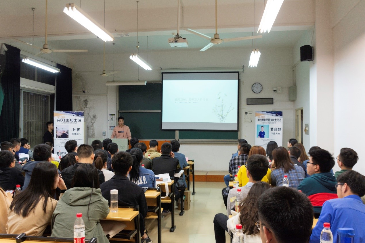 2019年4月12日晚18:30,土建学院举办的地产知士说·实习分享会——“冲呀!实习生”在工学部四教102顺利拉开序幕。研会邀请到入职半年就独当一面的2017届岩土工程专业毕业生曹晓麒,华润置地年度新锐的2018届优秀毕业研究生唐绪波,成功收获万科源动力成本岗实习的曹献华,玩转运营岗、投资岗和工程岗的孙骞以及玩转求职季的于飞作为本次活动的嘉宾,与同学们分享自己在实习、面试时积累的经验与感悟。