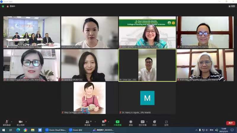 3月31日下午,菲律宾圣保罗大学马尼拉校区副校长玛丽·格蕾丝·梁森博士,护理与联合健康科学学院院长珍妮·奥利瓦尔博士,护理学研究生项目主席、国际化项目主任南希·阿吉拉博士,招生和国际化项目主任罗莎勒·迪松教授,注册部主任玛丽·伯纳黛特·莫拉多教授,菲律宾圣保罗大学中国学生服务中心主任罗永明博士、副主任泰西教授、副主任李静涵等8人与beat365就“3+0”护理专业合作办学项目召开第一次线上交流工作会。beat365校长单伟颖、副校长白兴武、继续教育与国际交流中心主任鲍晓萍、涉外护理系主任谭淑娟、护理系主任秦博文参加了线上会议。会议由罗永明主持。菲律宾圣保罗大学李楚琪博士担任本次会议的翻译工作。