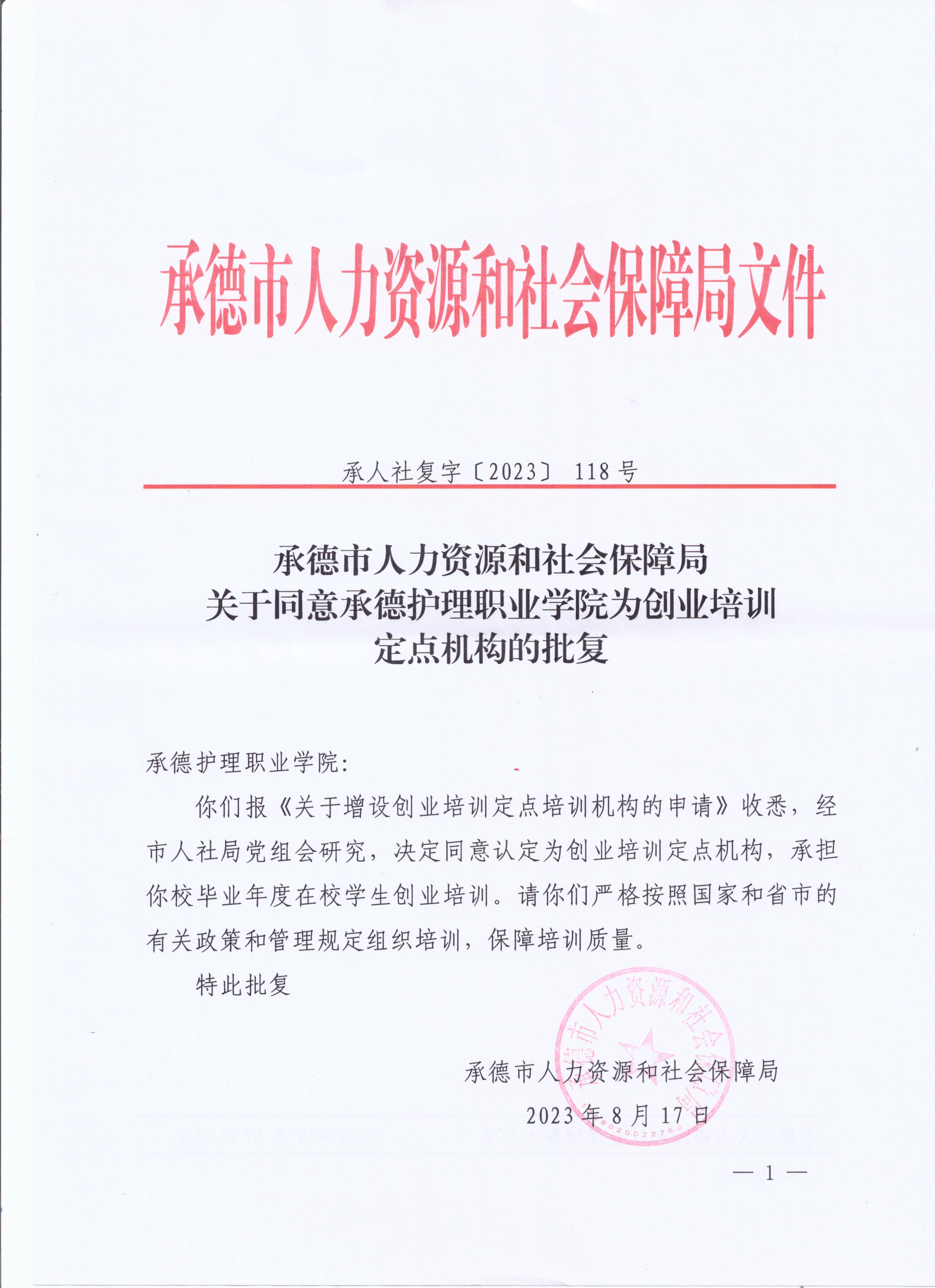 2023年8月17日,beat365正式被承德市人力资源和社会保障局批复为创业培训定点机构,承担beat365毕业年度在校学生创业培训。