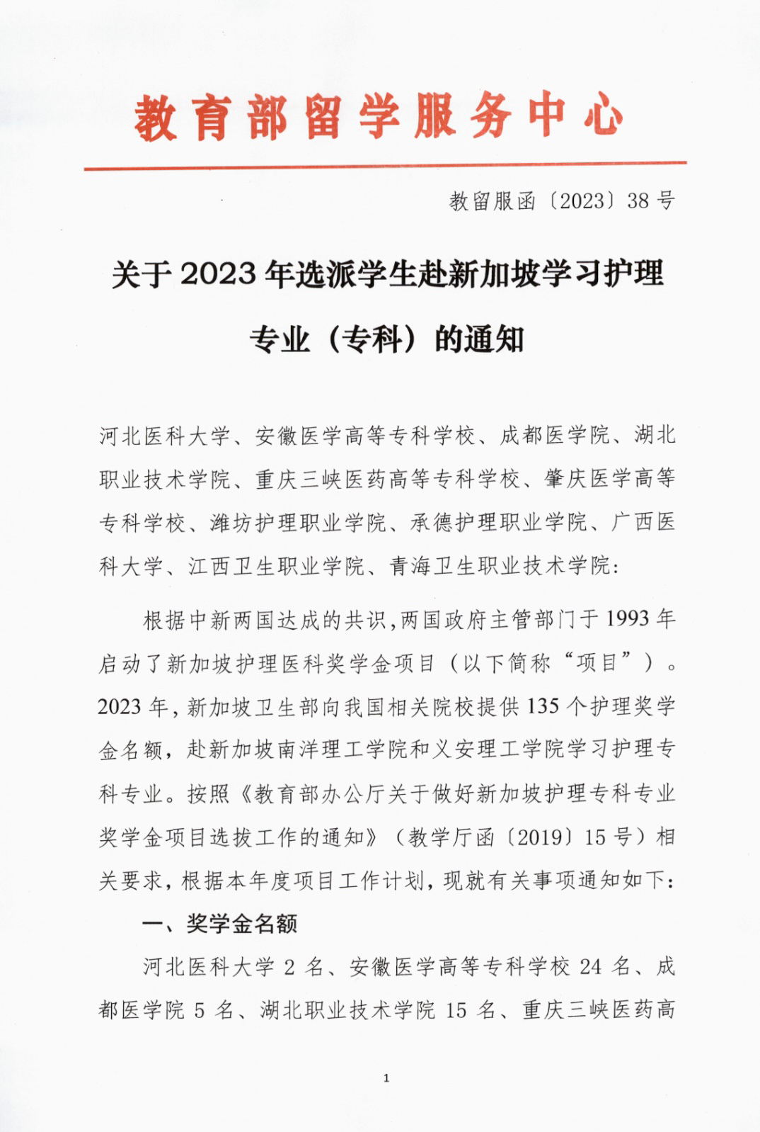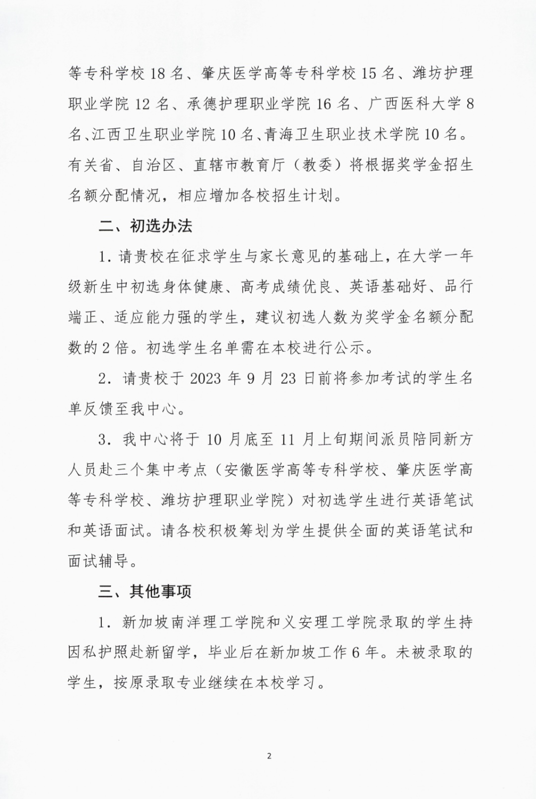 关于2023年选派学生赴新加坡学习护理专业(专科)的通知