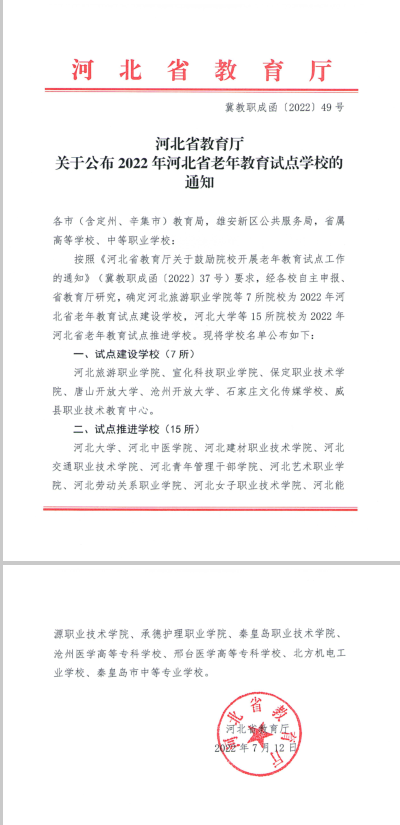 2022年7月收到省教育厅冀教职成函〔2022〕49号《关于公布2022年河北省老年教育试点学校的通知》,beat365正式批复为2022年河北省老年教育试点推进学校。