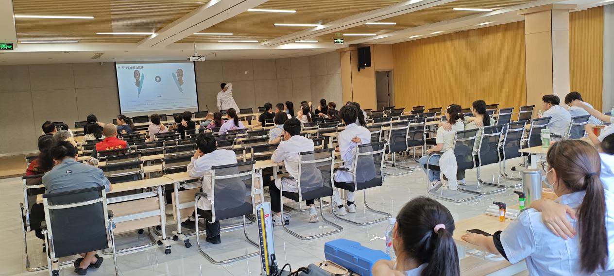 活动伊始,兰荣皓老师深入浅出地向社区居民科普了肩周炎的居家功能锻炼方法,详细地讲解了每一个动作的要领和注意事项,引导居民们积极参与到自我健康管理中来。随后,基础医学院的老师和社团的同学们充分发挥自己的专业优势,根据社区居民的身体情况,为他们提供血压测量、针灸、推拿、耳穴等项目,师生们以精湛的医术和耐心细致的服务赢得了居民们的高度赞誉和一致好评。