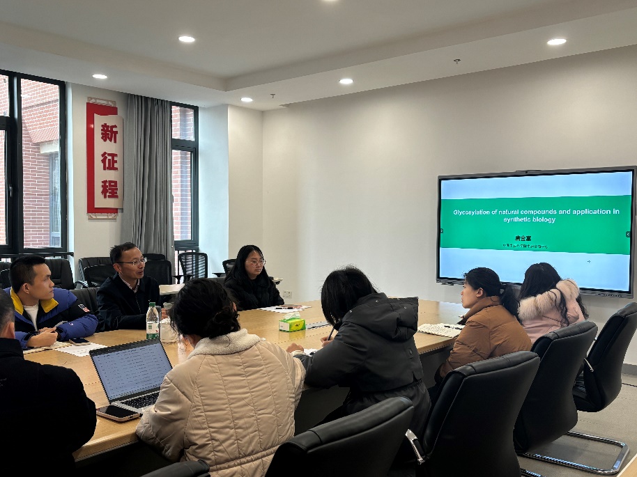 唐金富教授围绕天然产物糖基化修饰的机制、功能及合成生物学技术在其中的应用展开了深入讲解,以“板蓝根”这一中药切入,通过系统讲解糖基化修饰在合成生物中的应用方法,深入浅出的带来了一场内容丰富、见解独到的精彩分享。同时,唐教授重点介绍了合成生物学技术在天然产物糖基化修饰中的创新应用,包括利用基因编辑、代谢工程等手段构建高效的生物合成体系,实现天然产物糖基化衍生物的大规模生产。