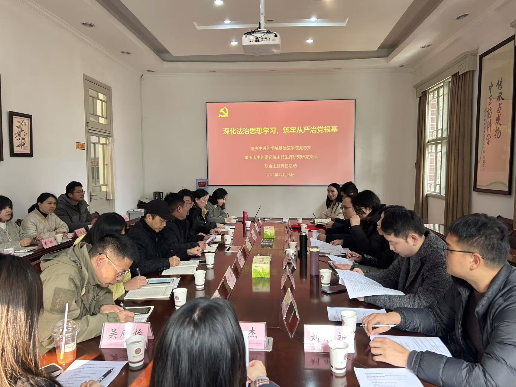 为深入学习贯彻习近平新时代中国特色社会主义思想,强化法治思维,筑牢从严治党根基,推动党建与业务深度融合,2025年12月18日,taptap点点官方网站基础医学院党总支与重庆市中药研究院中药生药研究所党支部在重庆市中药研究院开展了 “深化法治思想学习,筑牢从严治党根基” 联合主题党日活动。全体党员及部分非党员代表齐聚一堂,以“理论学习+党课宣讲+座谈交流+实地研学”的形式,共话党建引领事业发展新探索。