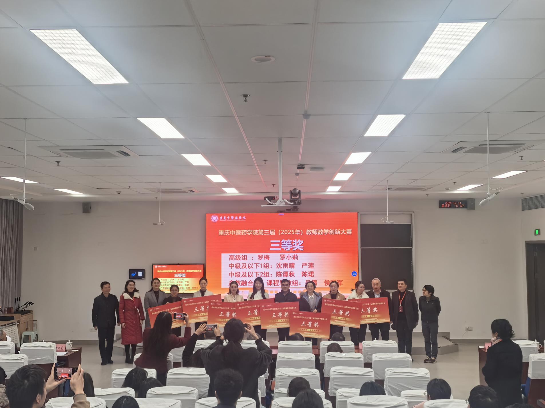 校工会副主席雷治政现场宣读了比赛结果。在热烈的掌声中,获奖团队教师代表依次上台领奖。