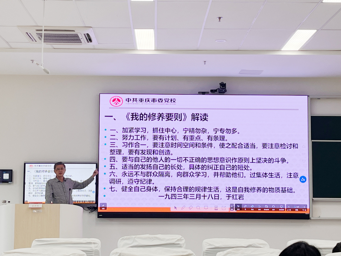 2024年4月22日,继续教育学院全体教职工参加了学院组织的中国共产党人的一面不朽旗帜——周恩来(我的修养要则)解读讲座。
