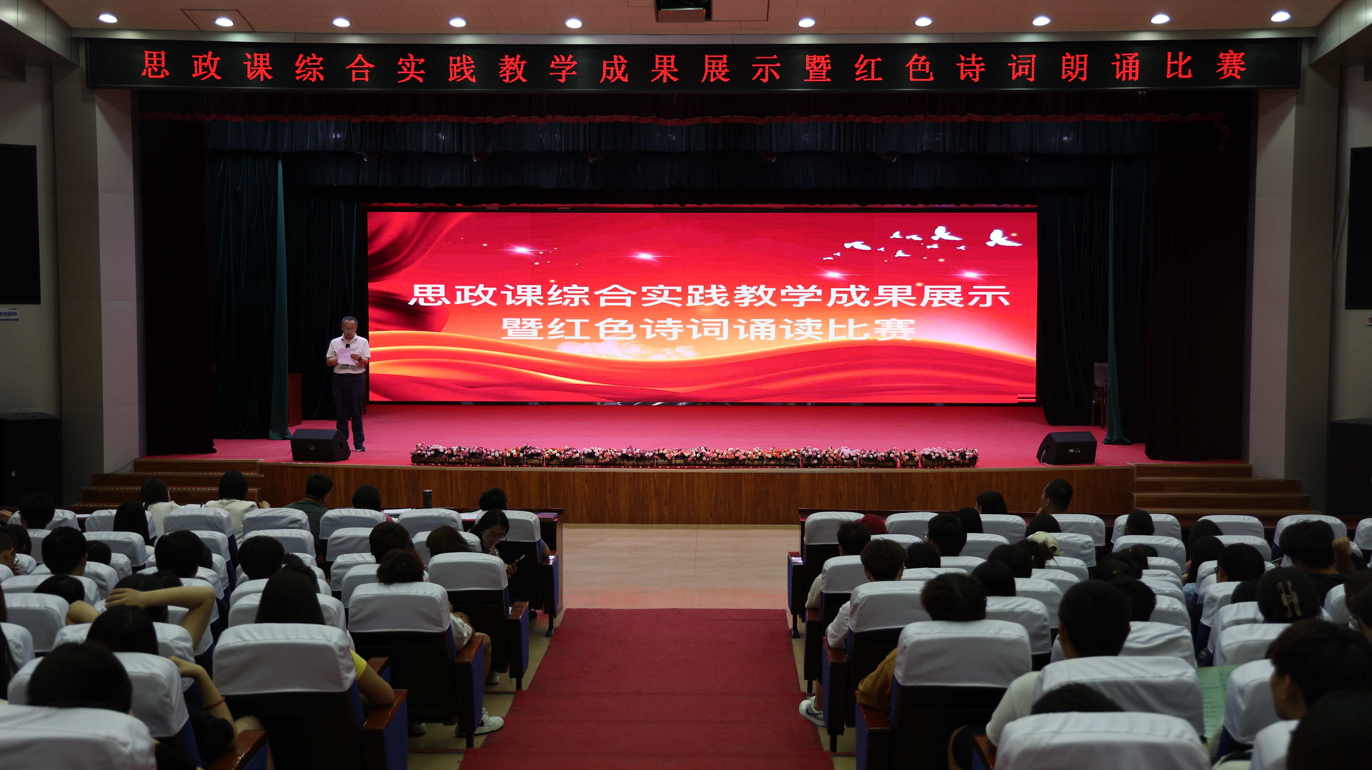 为深入学习贯彻习近平总书记在学校思想政治理论课教师座谈会的重要讲话和新时代学校思政课建设推进会的指示精神,在中国共产党成立103周年之际,7月2日,学校举行思政实践课成果展示暨红色诗词诵读比赛。宣传部(统战部、工会)、学生工作部(团委)、教务处、基础部等部门领导、思政部全体教师及学生代表现场观看。