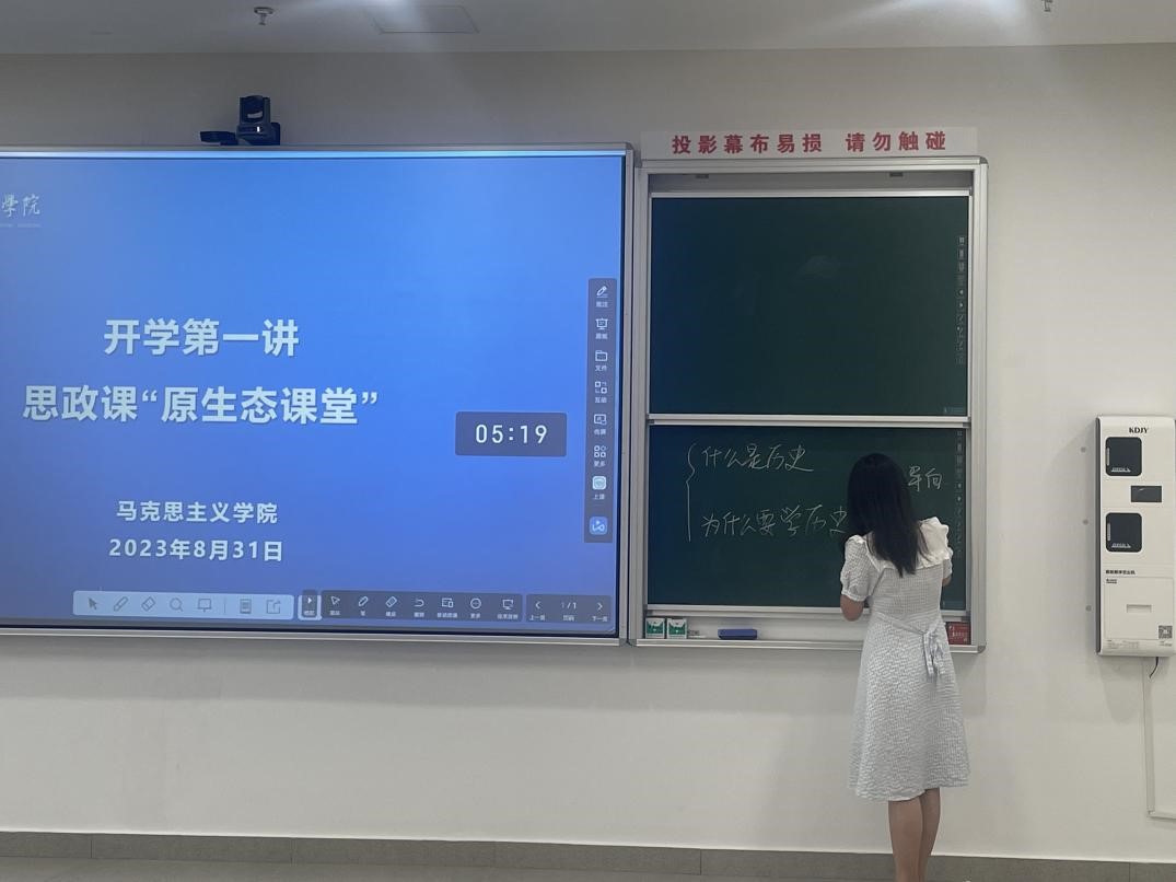 此次“开学第一讲”——思政课“原生态课堂”活动采用无PPT模式,教师主要靠口头表达和传统板书站稳讲台,以应对当前信息化环境下教师传统教学基本功缺乏训练的问题,从而打造思政课的“原生态课堂”。