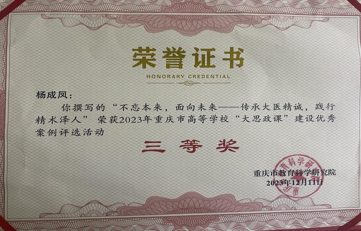 近日,重庆市教育科学研究院揭晓了2023年重庆市高等学校“大思政课”优秀案例评选活动获奖名单,马克思主义学院杨成凤老师的作品《不忘本来,面向未来——传承大医精诚,践行精术泽人》脱颖而出,荣获三等奖,展现了杨老师在思想政治教育领域的深厚造诣。