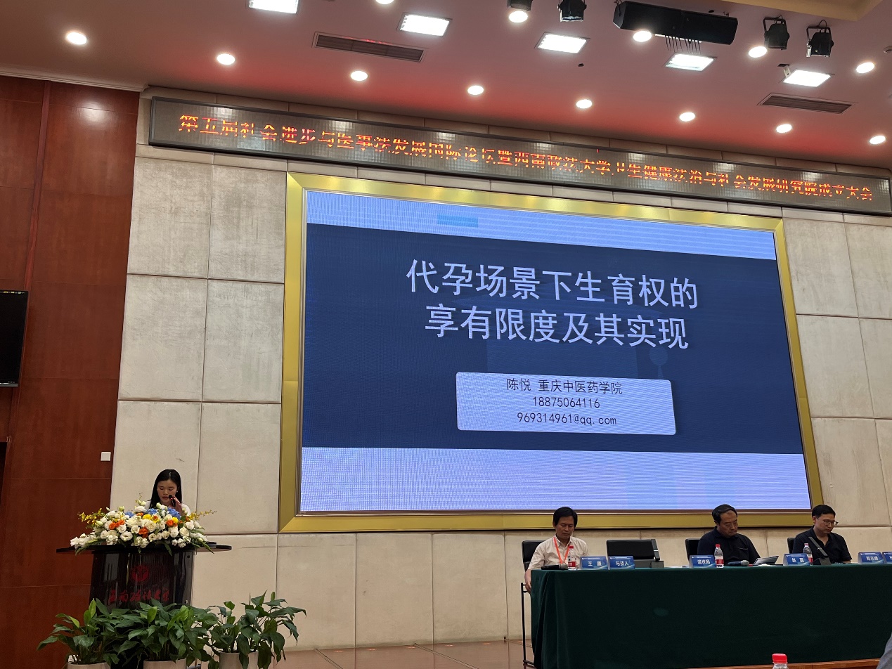本次论坛设立了开幕式、主旨演讲、分论坛研讨等环节,来自国内外卫生健康法学领域专家学者围绕卫生健康法学理论与实践前沿问题、高质量发展的路径研讨、卫生健康法领域的产学研协同创新等主题进行了交流探讨。会上,马克思主义学院陈悦老师作了题为《代孕场景下生育权的享有限度及其实现》的主旨报告,介绍了生育权的再界定及其在代孕场景下的适用、代孕场景下生育权的享有:质疑与证成、代孕场景下生育权的实现机制等内容。
