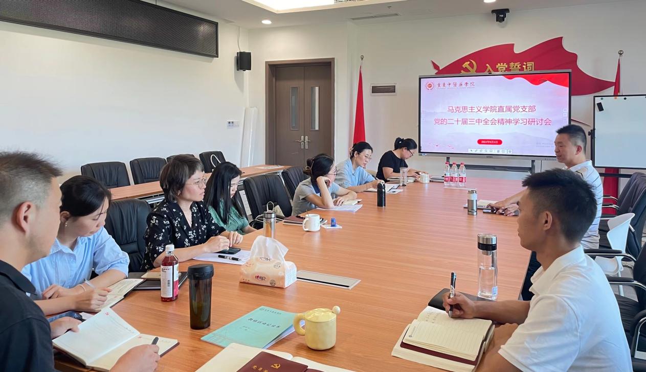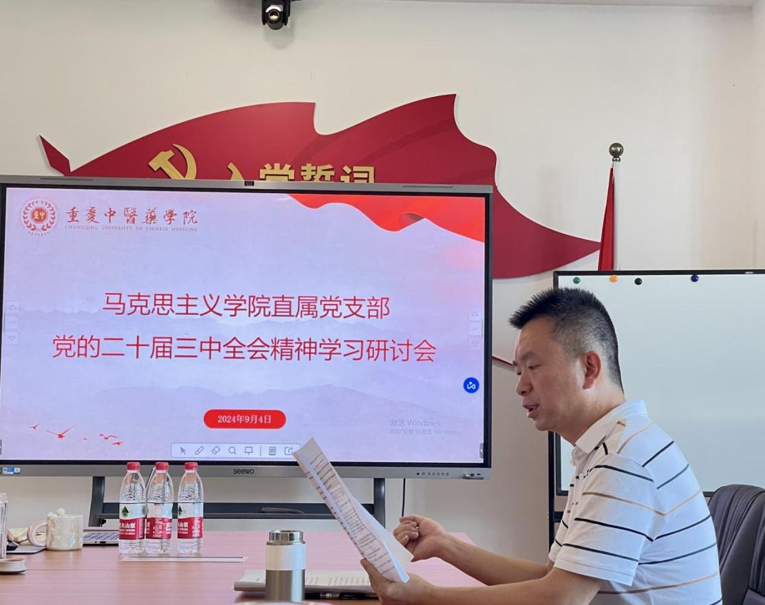 马克思主义学院直属党支部书记、院长代浩云解读了党的二十届三中全会精神。他首先回顾了至党的十一届三中全会以来历次三中全会的简况;然后介绍了党的二十届三中全会概况,重点解读了《中共中央关于进一步全面深化改革 推进中国式现代化的决定》;最后,他指出马克思主义学院学习贯彻党的二十届三中全会精神,需要深入推进中医药文化育人教育教学改革。要持续探索“一大四新”,即以中医药文化为抓手,通过构建中医药文化“大思政课”,创新路径、创新机制、创新平台,深度挖掘中医药文化育人价值,切实构建大思政格局。
