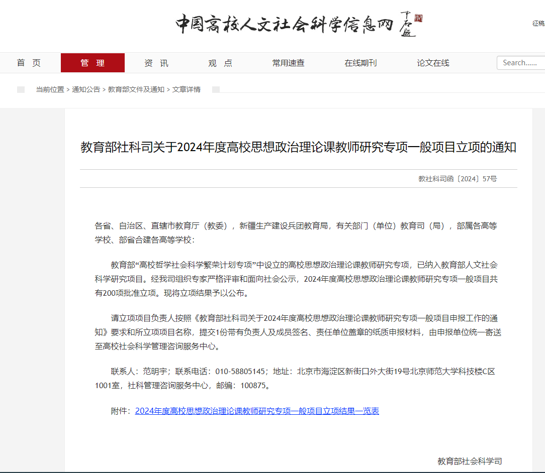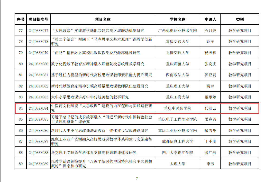 近日,教育部发布了“2024年度高校思想政治理论课教师研究项目”立项通知,taptap点点马克思主义学院代浩云教授主持申报的“中医药文化赋能‘大思政课’建设的内在逻辑与实践路径研究”获批立项,实现了学校教育部人文社科项目的突破。